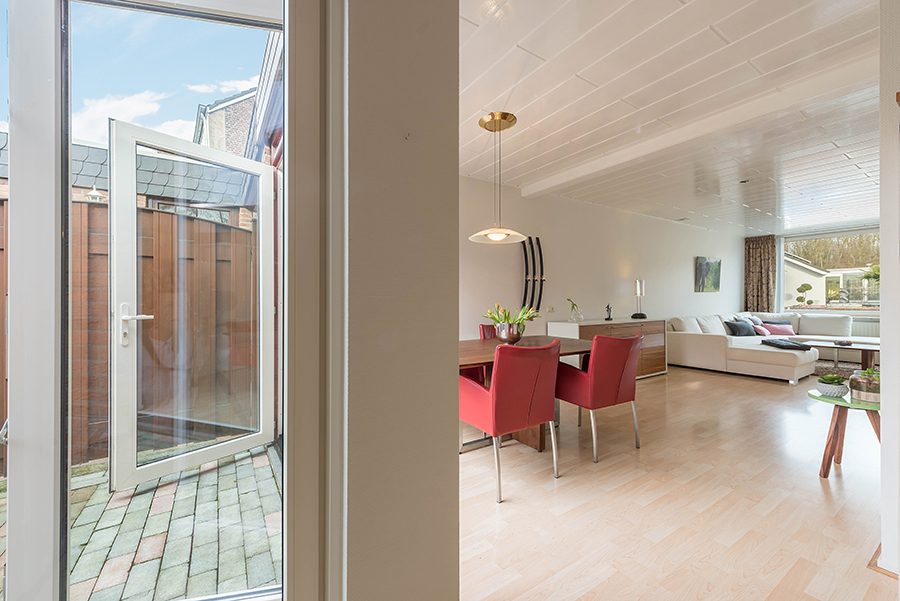 Riante living ca. 10.00×5.50/3.25 met laminaatvloer en openslaande deuren naar het terras.