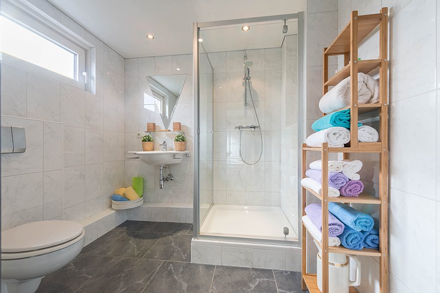 Modern betegelde badkamer met douche, wastafel en een 2e toilet.