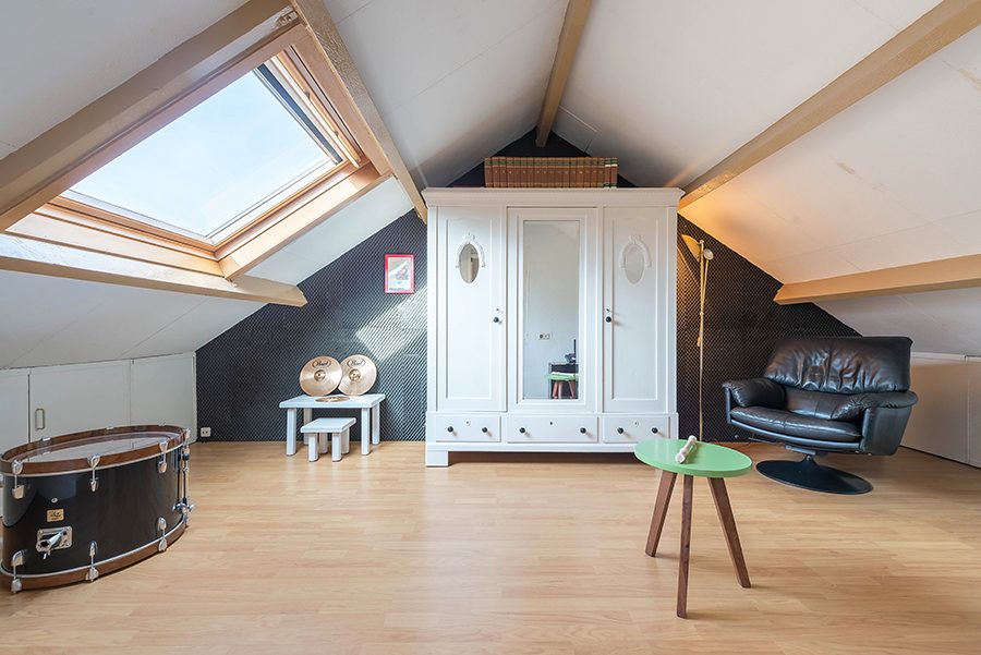 Vaste trap naar overloop met toegang tot een 4e slaapkamer ca. 5.00×3.00 met dakraam en bergkasten onder de trap.