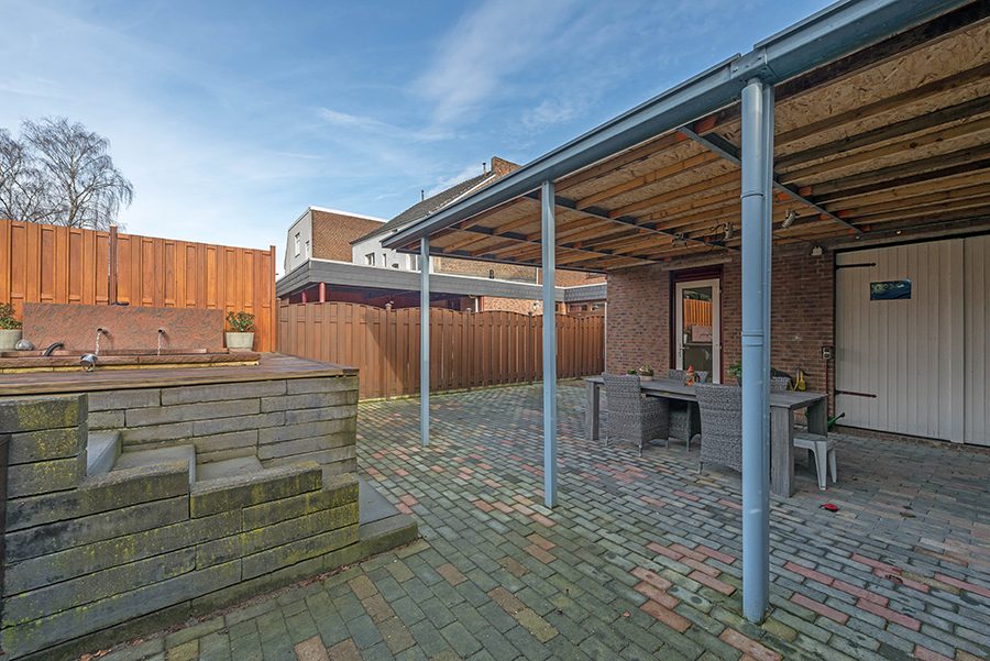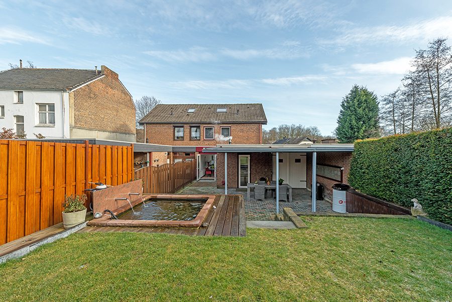 De geheel omsloten siertuin is recentelijk nieuw aangelegd met overdekt zonneterras en siergazon met waterspel.