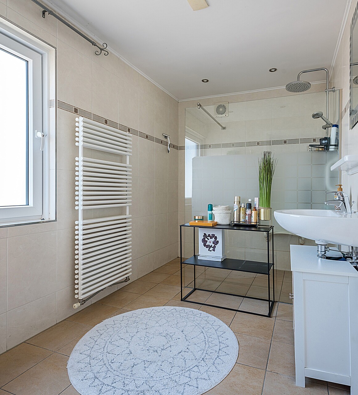 Twee badkamers resp. ca. 3.30 x 2.00 met inloopdouche en wastafelmeubel en ca. 2.25 x 1.90 met ligbad, wastafel en toilet.