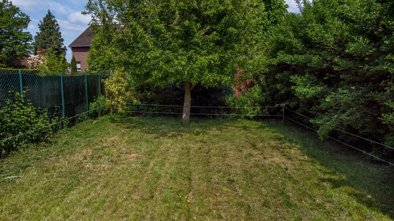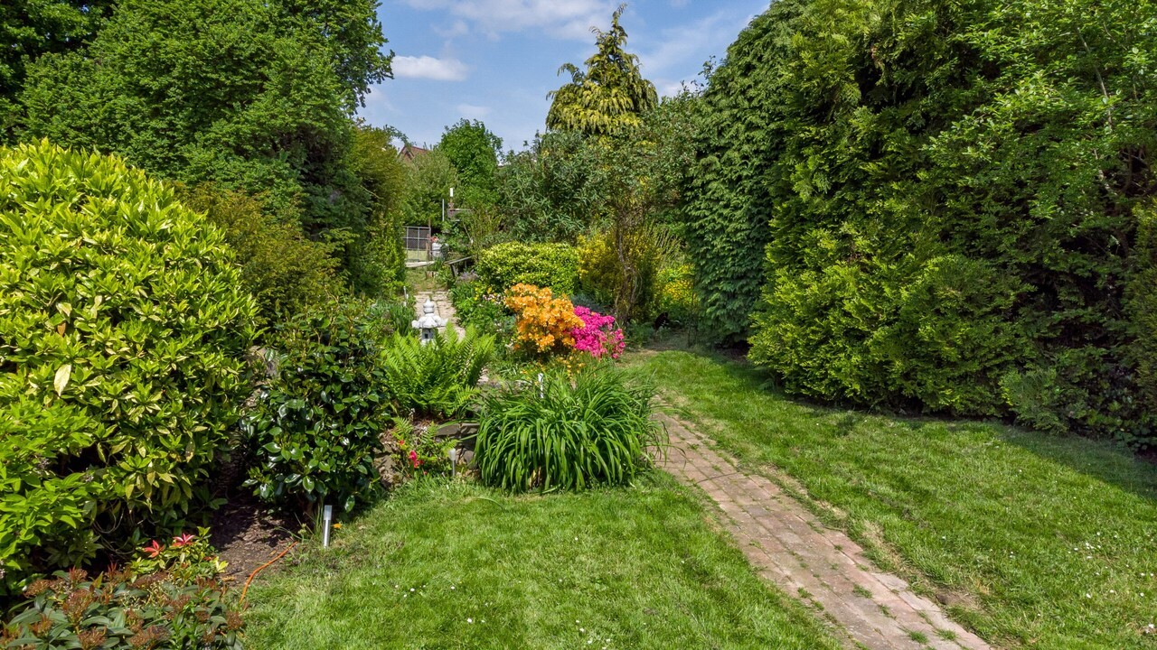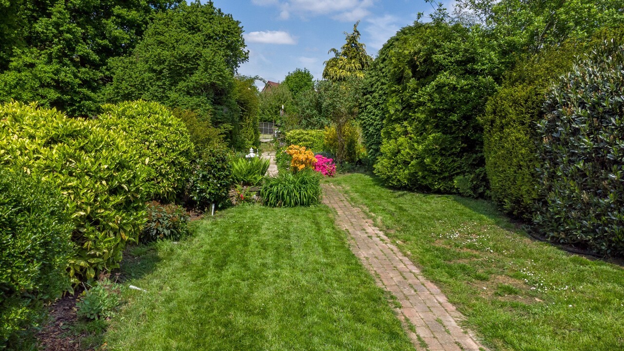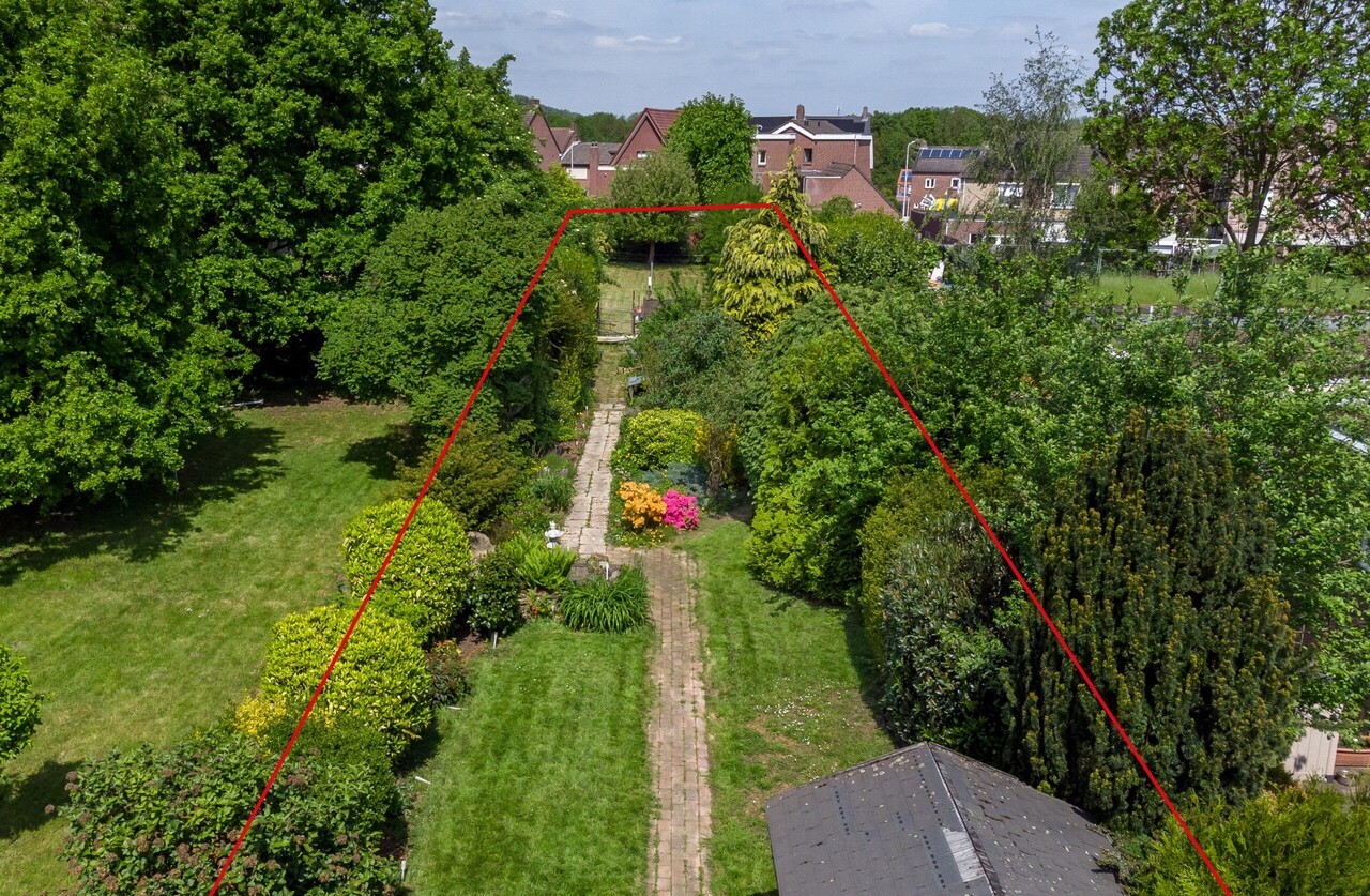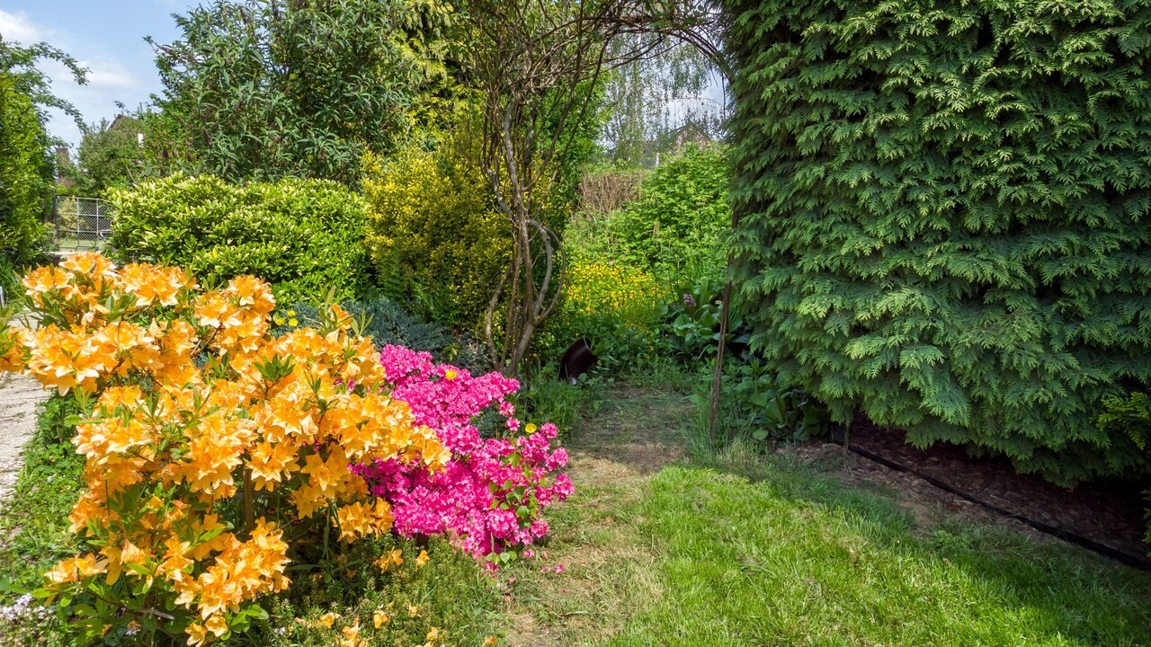 Diepe siertuin met tuinhuis en eigen huisweide met fruitbomen.