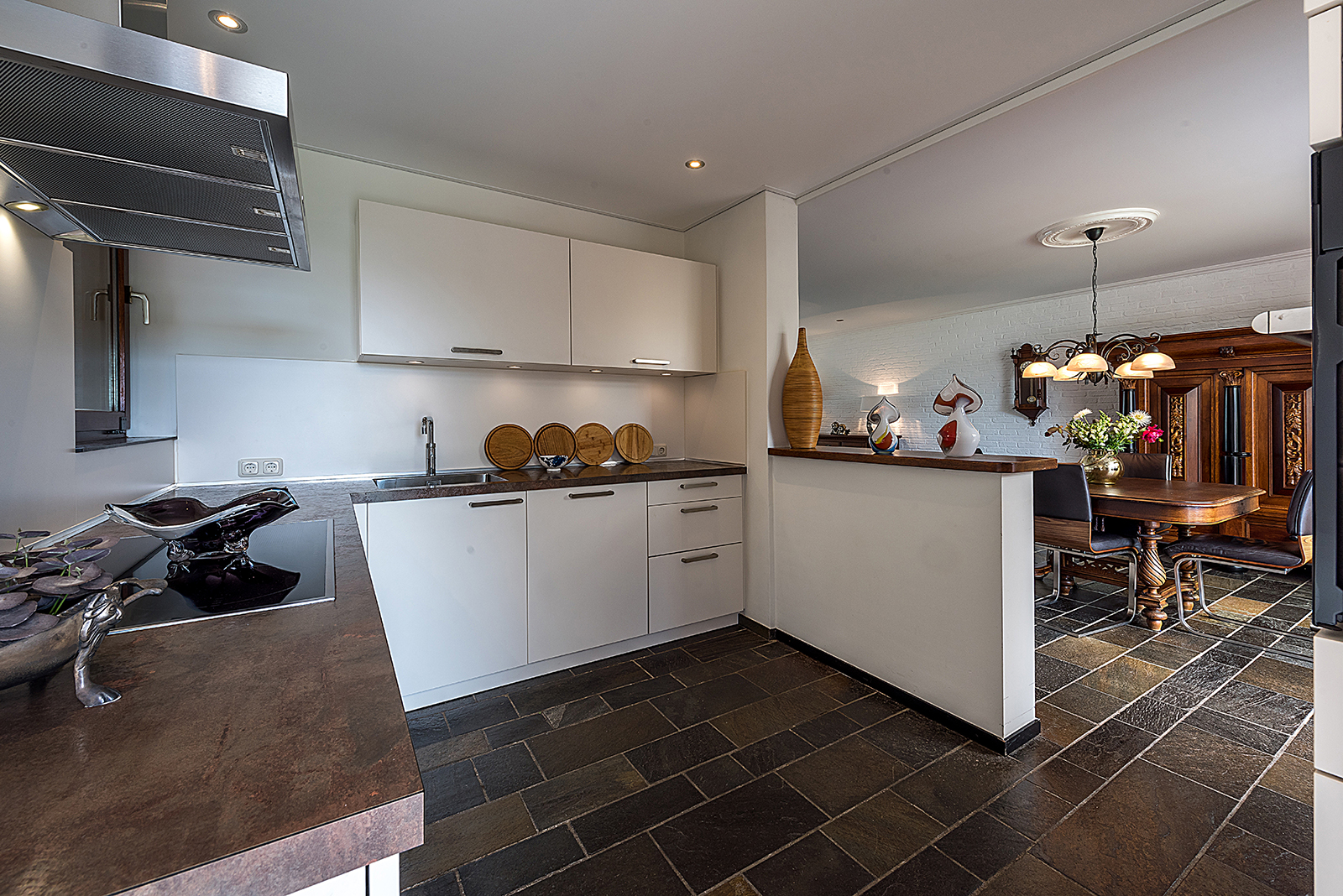 Open keuken ca. 3.70 x 3.00 met moderne aanbouwkeuken v.v. Siemens apparatuur met o.a. inductie kookplaat, combi-oven, koelkast en vaatwasser.