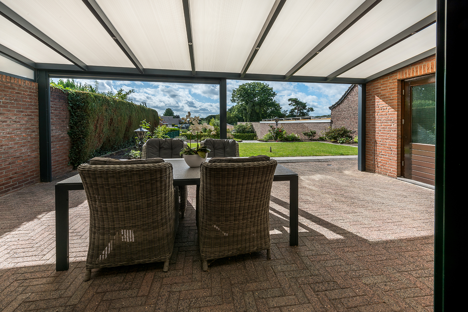 Overdekt zonneterras met aansluitend grote fraai aangelegde en onderhouden siertuin.