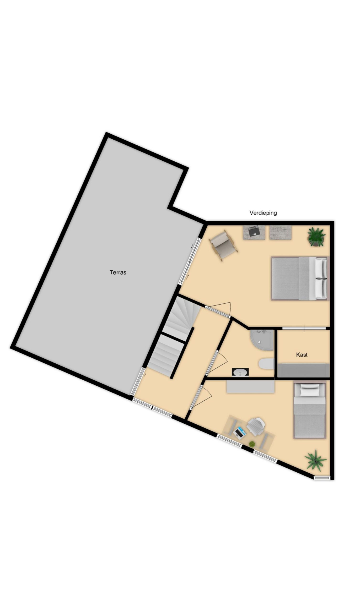 Woonkamer ca. 8.00 x 5.00/4.00 met tegelvloer, airco en schuifpui naar de tuin.