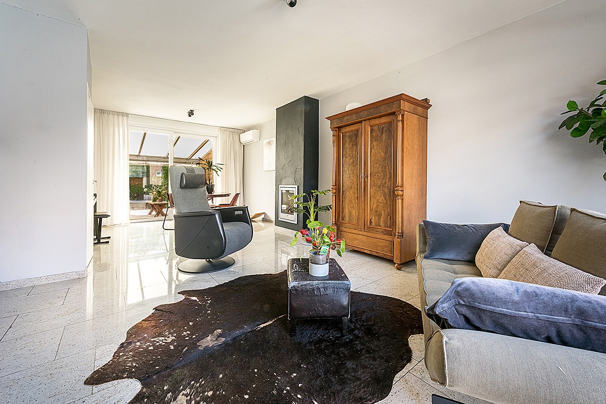 Doorzonwoonkamer ca. 7.52 x 3.60 met granieten vloer, gashaard, airco, muurkast en schuifpui naar het overdekte terras.