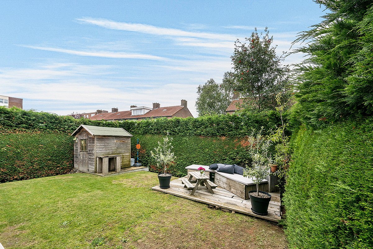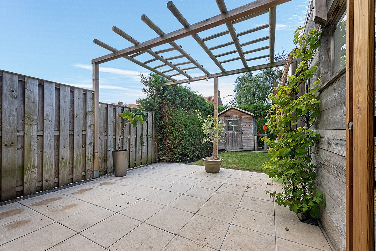 Omsloten siertuin met op Zuid-Westen gelegen met tuinhuis en zij-uitgang naar inrit met carport.