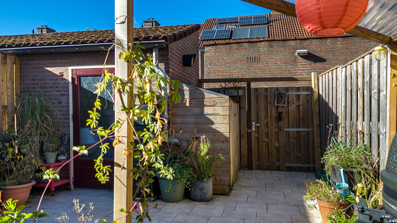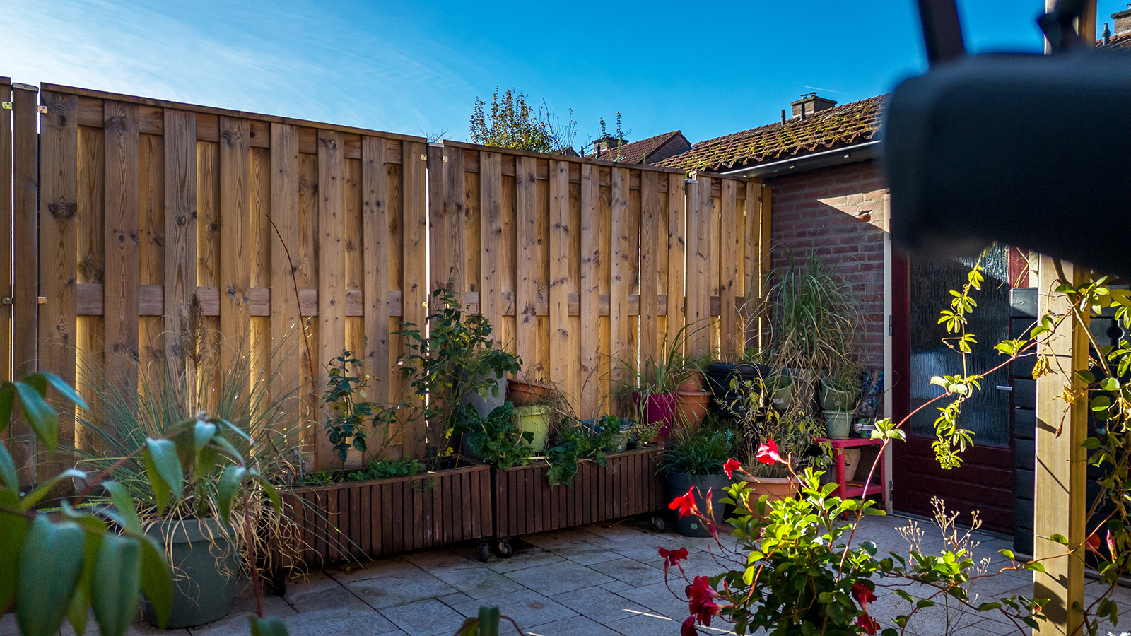 Zonnige omsloten en onderhoudsvrije siertuin met achteruitgang naar een pad aan de achterzijde.