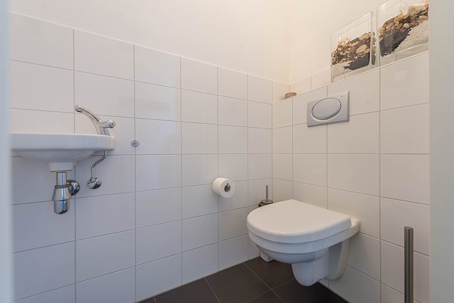 Entree/hal met meterkast, gastentoilet met hangtoilet en fonteintje. Trap naar de verdieping.