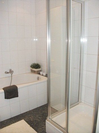 Luxe betegelde badkamer met granieten vloertegels, ligbad, douche, vaste wastafel en een designradiator.
