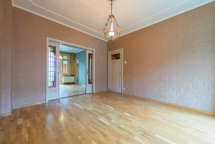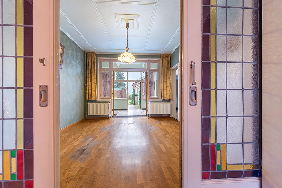 Woonkamer ensuite ca. 9.00 x 3.65 met parketvloer en openslaande deuren naar de serre ca. 3.85 x 2.80.