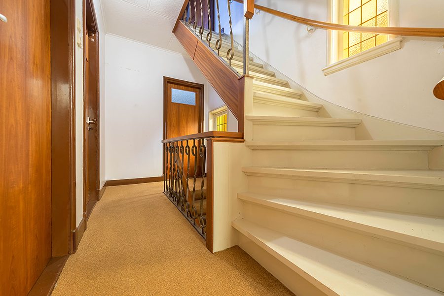 Ruime hal met authentieke tegelvloer, meterkast en trap naar de verdieping.