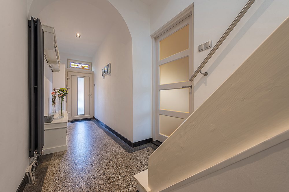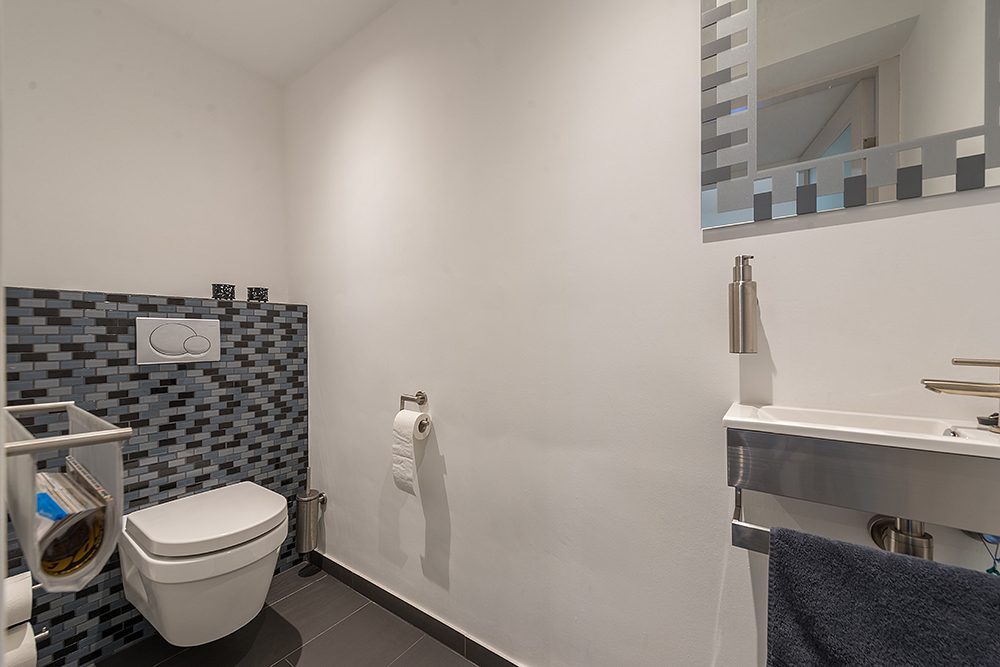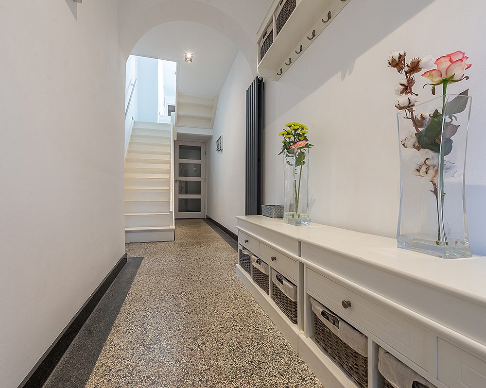 Entree/hal met authentieke terrazzo vloer, meterkast en modern gastentoilet met hangtoilet en fonteintje.