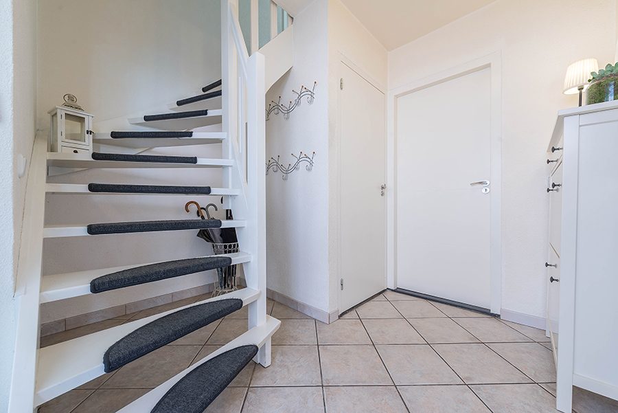 Entree/hal met tegelvloer, vernieuwde meterkast met o.a. satelliet aansluiting en gastentoilet met hangtoilet en fonteintje.