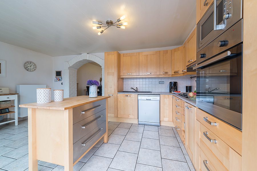 Ruime living ca. 8.50×5.50/2.70. Grote aanbouw ca. 5.50×3.00 met leefkeuken en schuifpui naar de tuin. Moderne aanbouwkeuken in hoekopstelling v.v. gascomfort, afzuigkap, oven, magnetron, koelkast en vaatwasser. De gehele begane grond is voorzien van een tegelvloer.