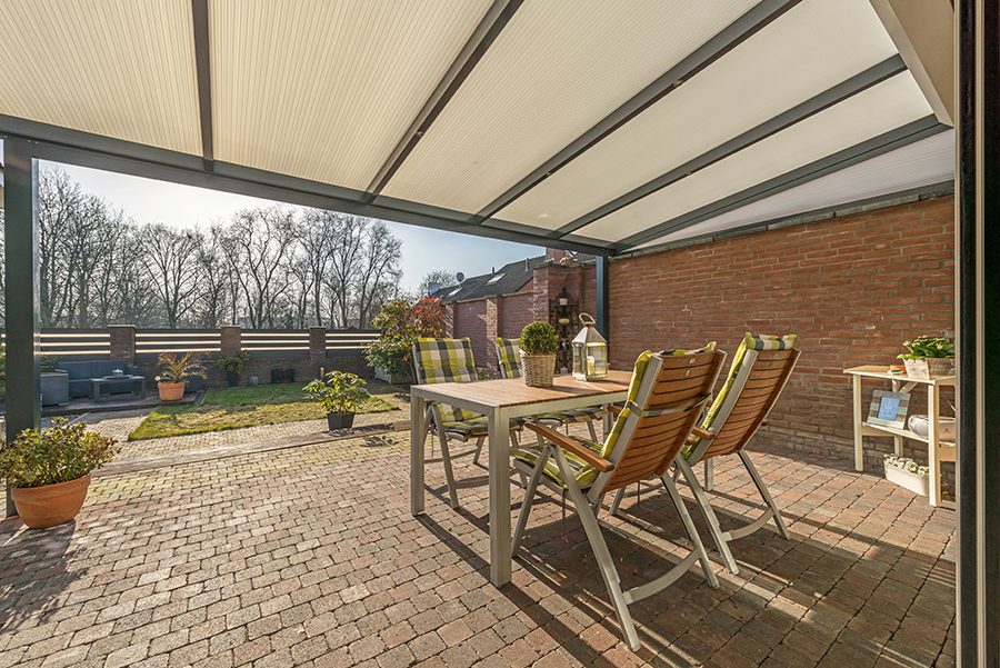 Vanuit de keuken schuifpui met schuifhor naar een overdekt zonneterras met inbouwhalogeenverlichting. Omsloten en onderhoudsvrije siertuin op zuiden gelegen met fraai uitzicht aan de achterzijde. Buitenberging.