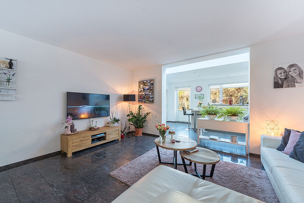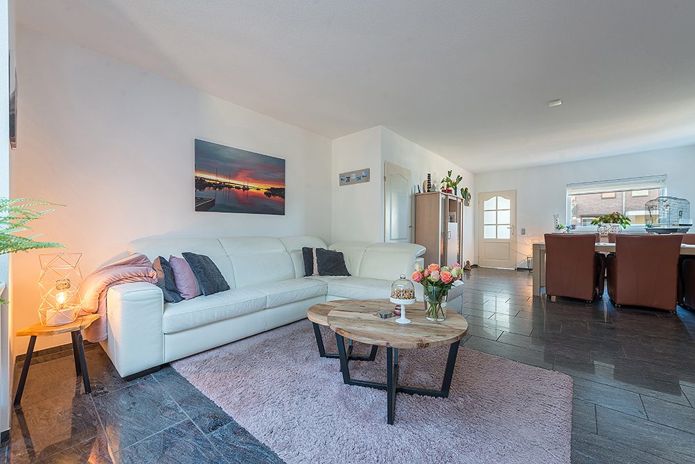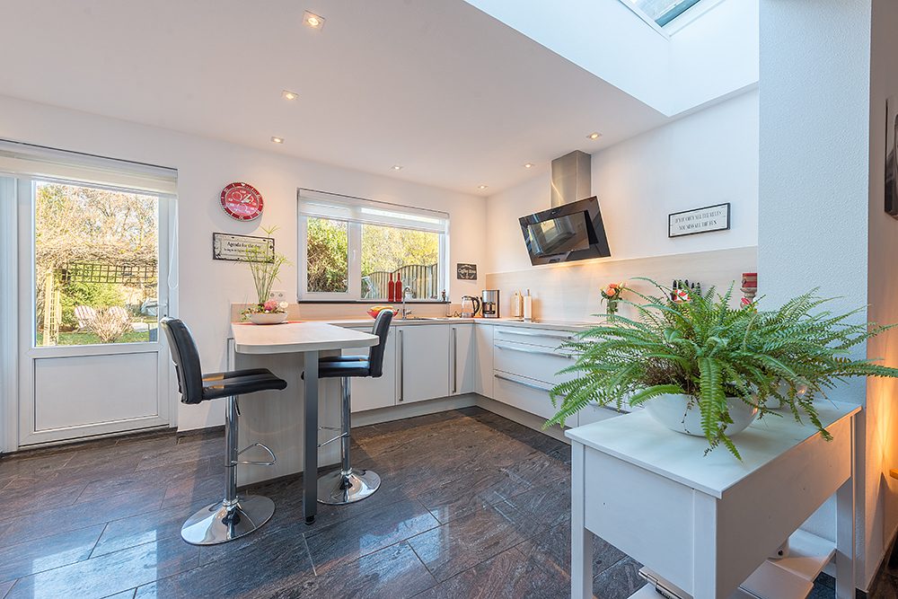 Ruime living ca. 8.25 x 4.95 met aansluitend grote aanbouw ca. 5.00 x 3.00 met lichtstraat, vernieuwde aanbouwkeuken in hoekopstelling v.v. inductie kookplaat, afzuigkap, oven, koelkast, vaatwasser en inbouwhalogeenverlichting. Uitgang naar de tuin.
