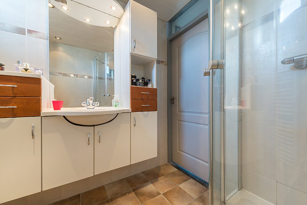 Badkamer met douche, wastafelmeubel en een 2de toilet.