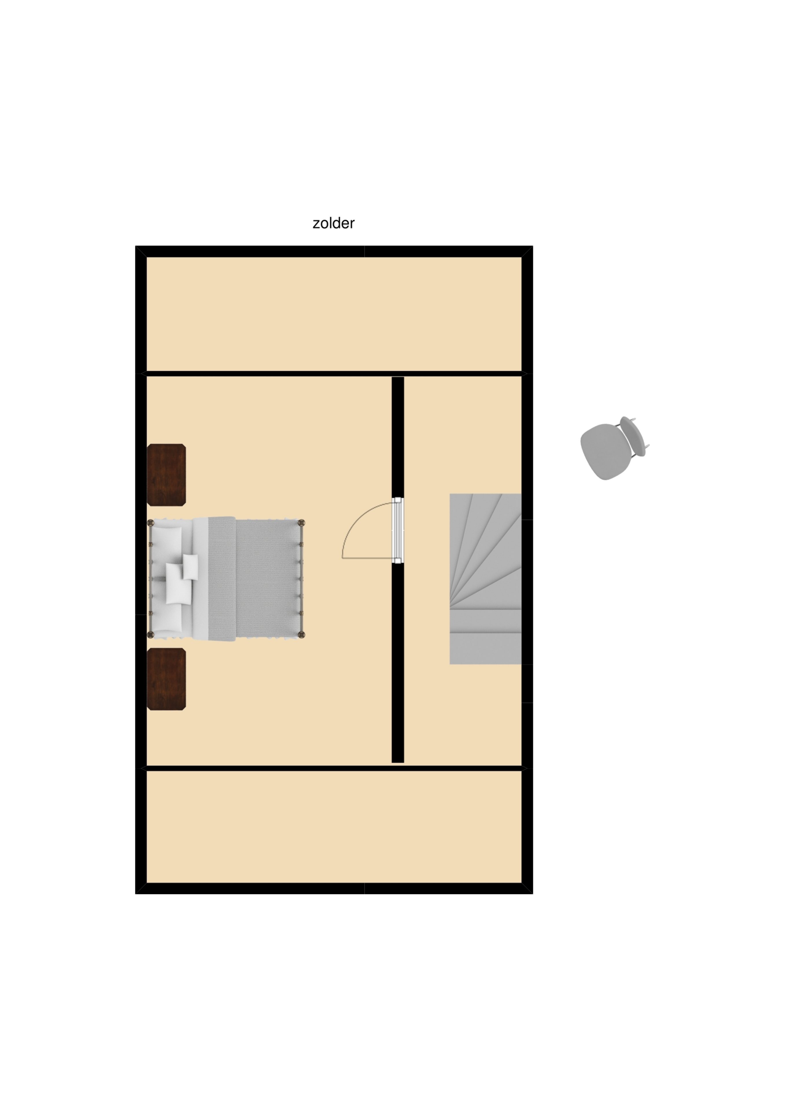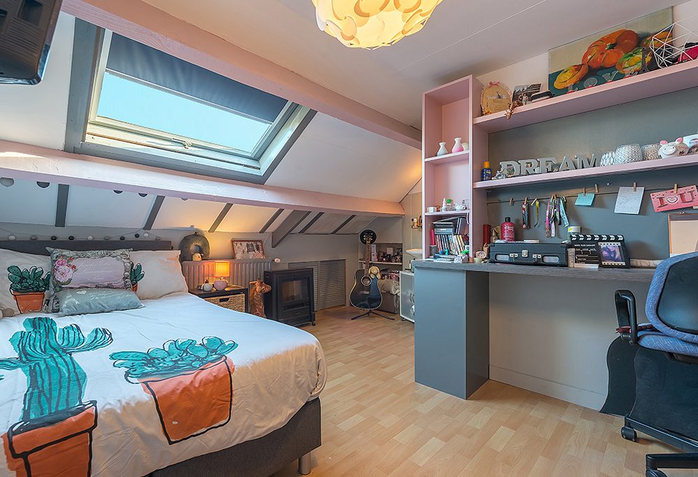 Vaste trap naar een overloop, 4de slaapkamer ca. 4.00 x 3.00 met dakraam en bergkasten onder de kap.