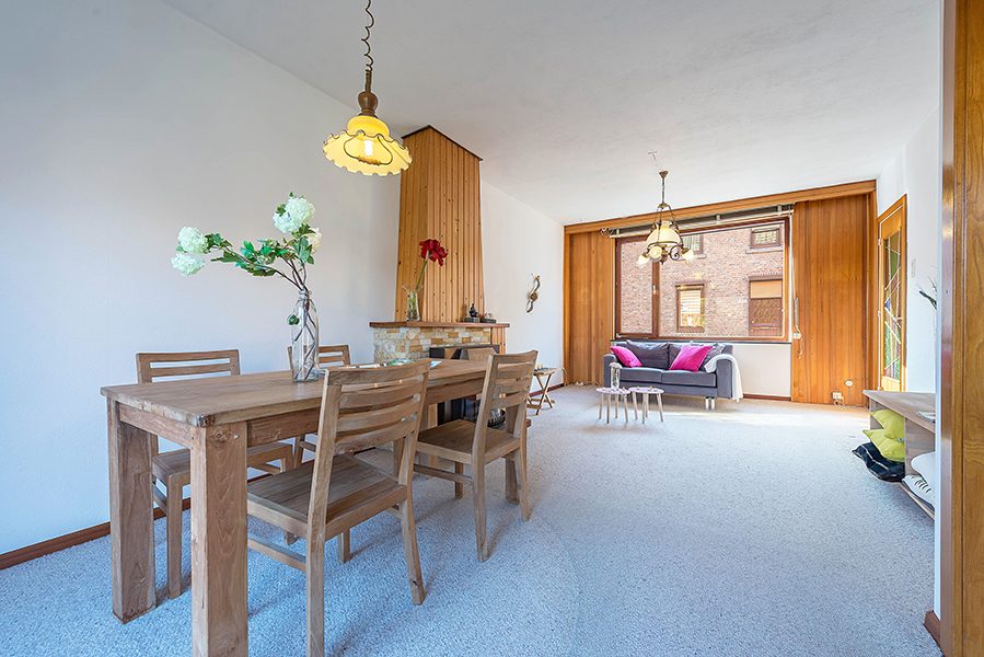 Doorzonwoonkamer ca. 6.80 x 3.80/3.10 met openslaande deuren naar het terras.