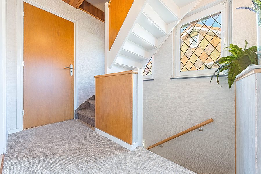 Entrée/hal met tegelvloer, vernieuwde meterkast, gastentoilet en trap naar de verdieping.