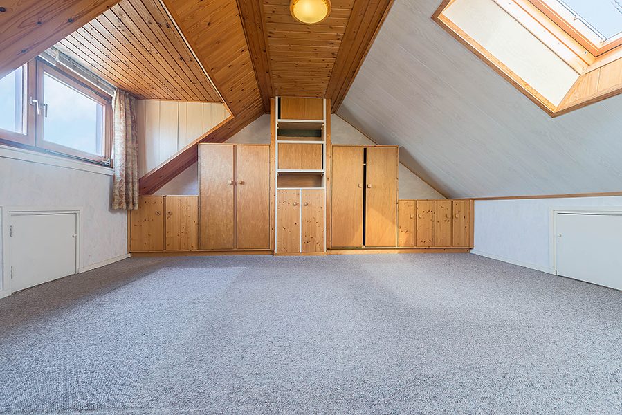 Vaste trap naar overloop, slaapkamer ca. 3.80 x 3.50 met dakkapel en dakraam, bergkasten onder de kap.