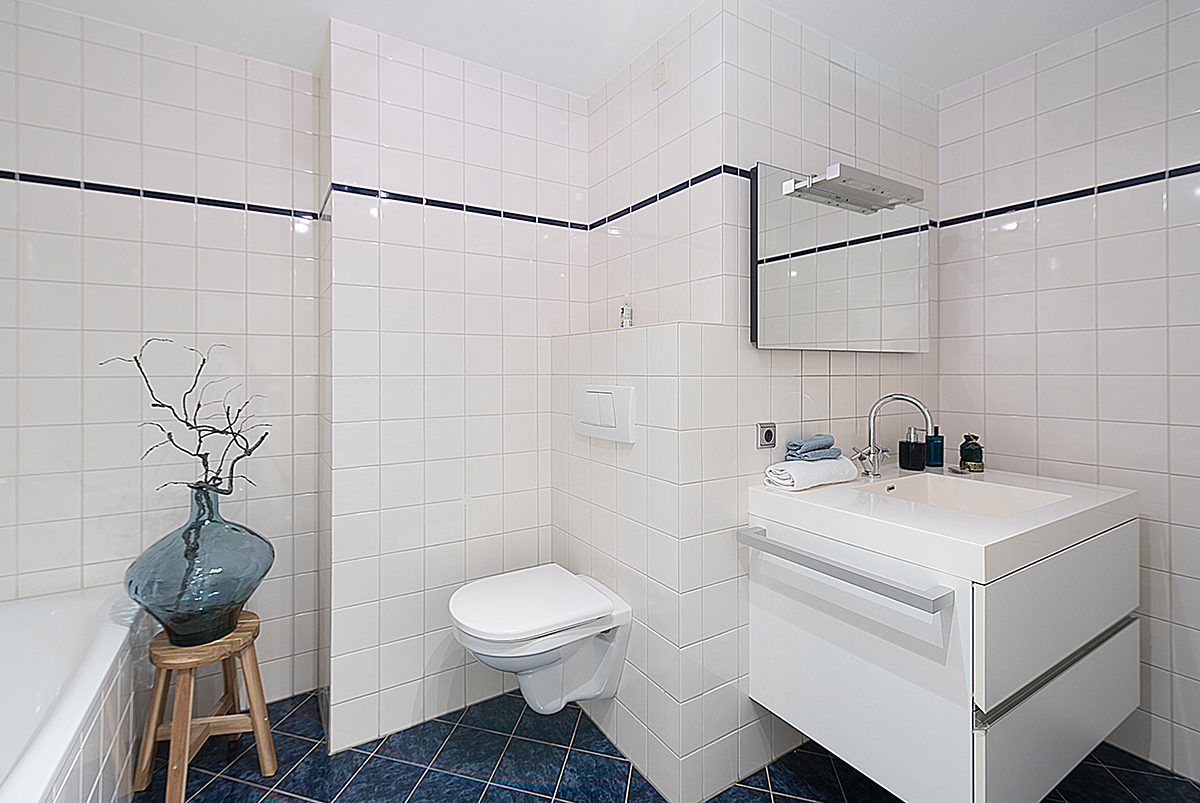 Ruime badkamer met ligbad, douche, wastafel en 2e toilet. De badkamer is v.v. vloerverwarming.