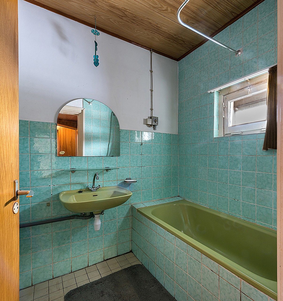 Badkamer met ligbad, wastafel en cv-combiketel.