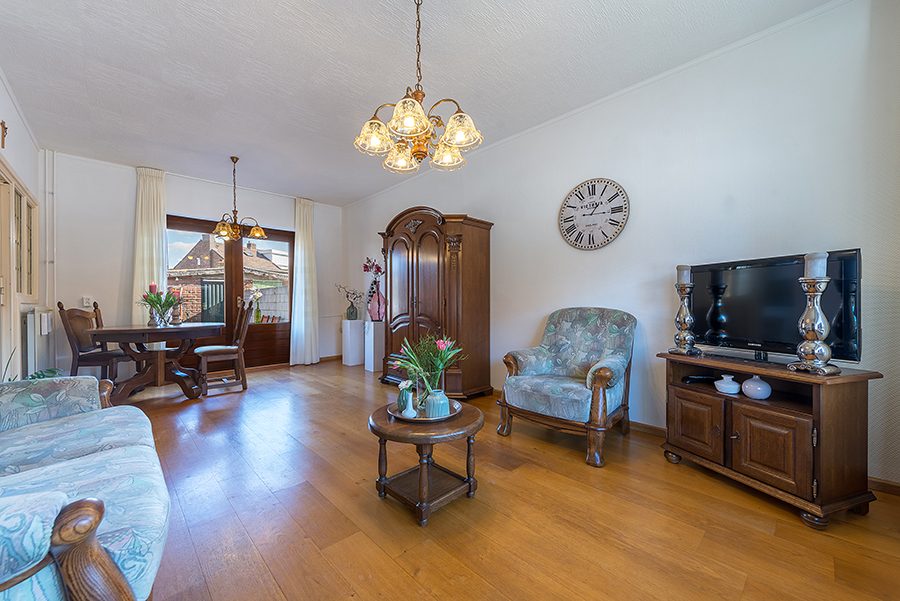 Woonkamer ca. 6.40 x 3.80 met parketvloer en openslaande deuren naar de tuin.