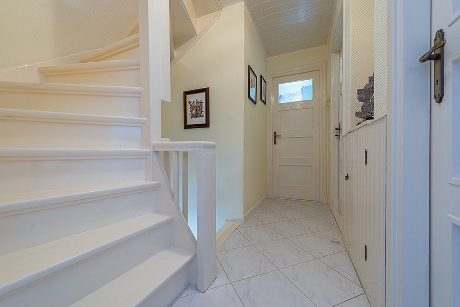 Entree/hal met tegelvloer, gastentoliet, meterkast en trap naar de verdieping.