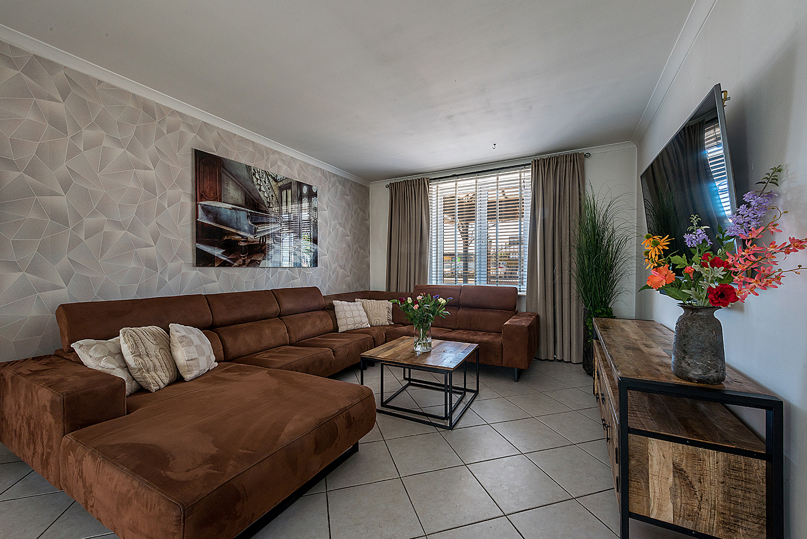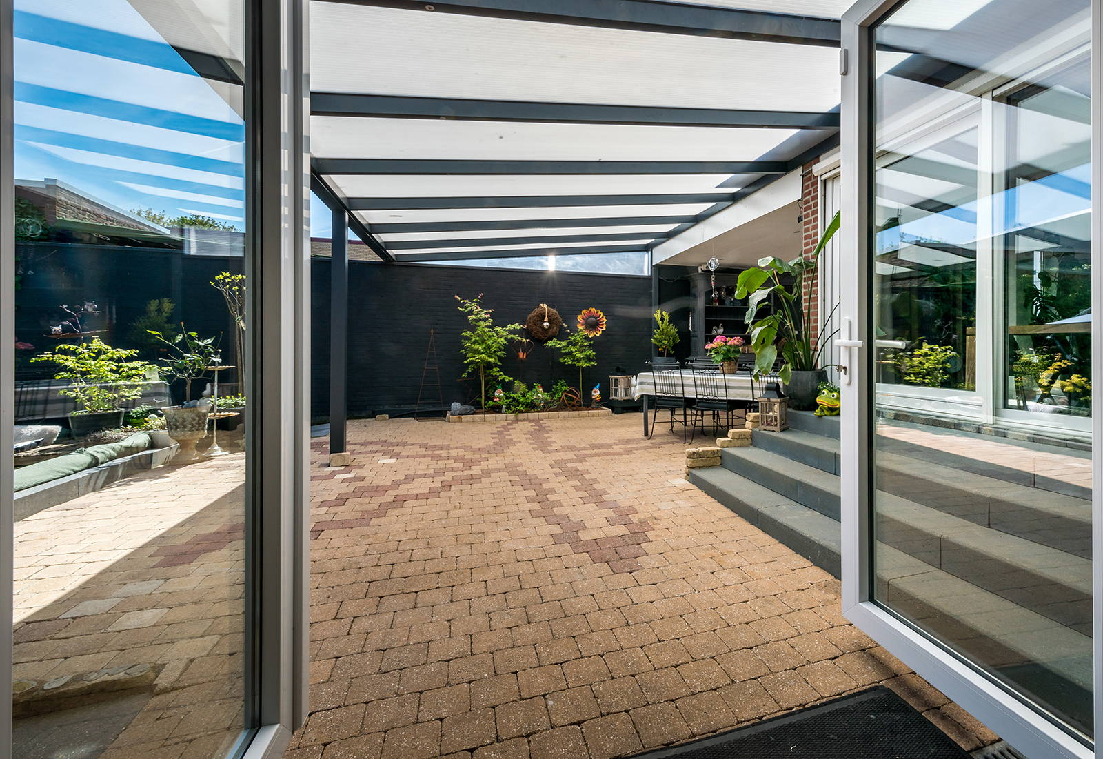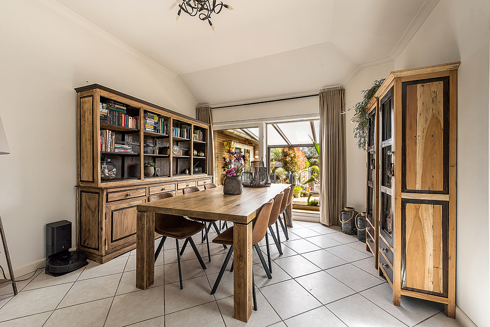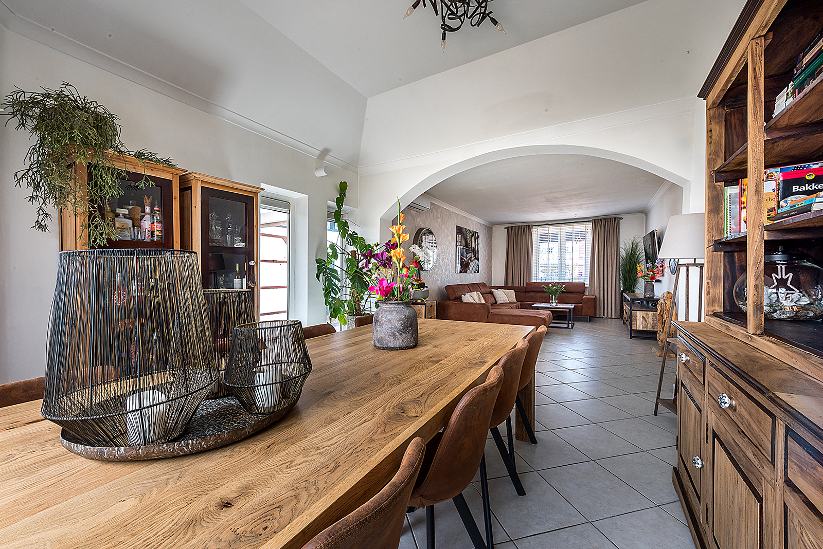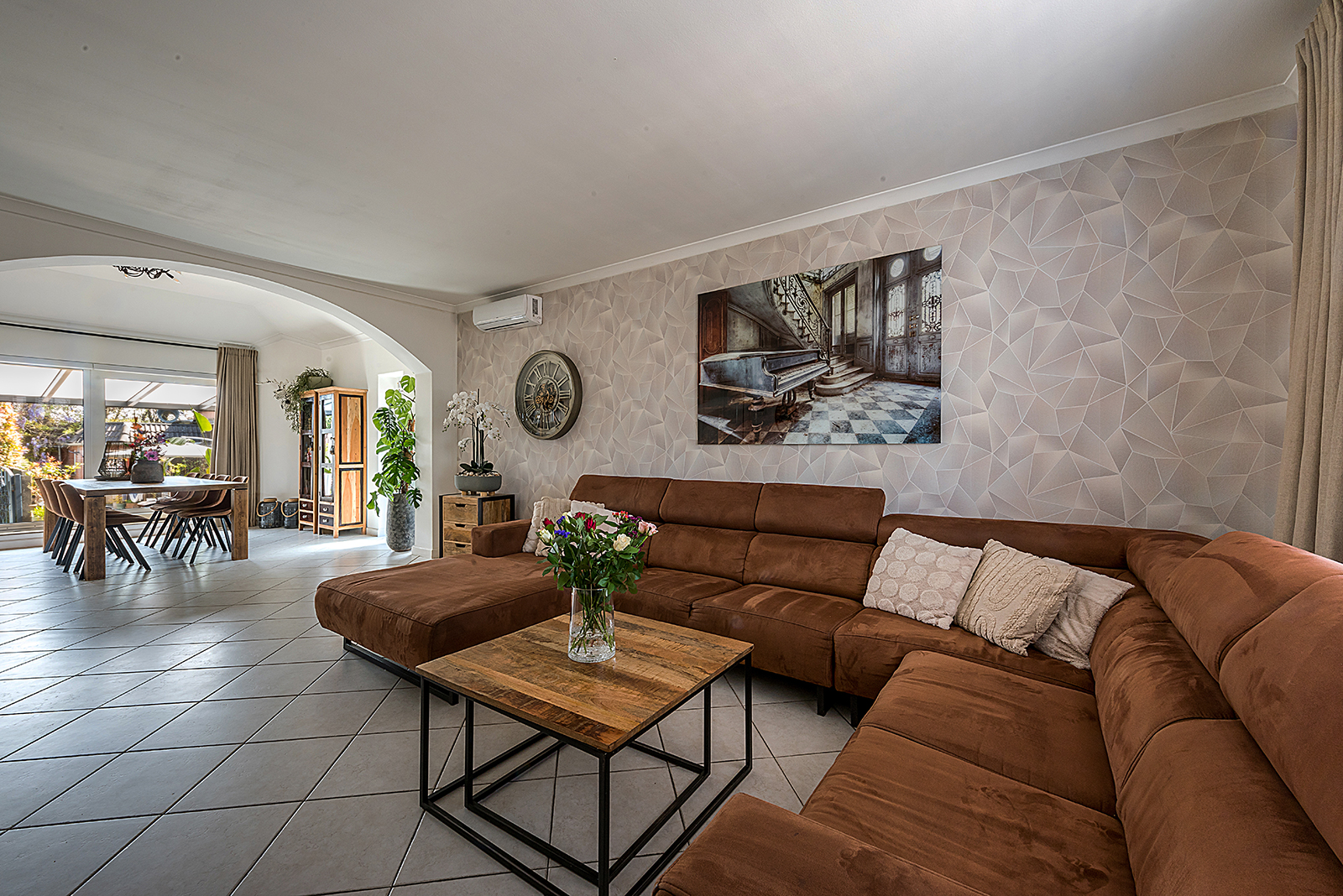 De royale woonkamer is afgewerkt met een tegelvloer, airco en voorzien van comfortabele vloerverwarming. Dankzij de schuifpui staat de woonkamer in directe verbinding met de tuin, waardoor binnen en buiten naadloos in elkaar overlopen.