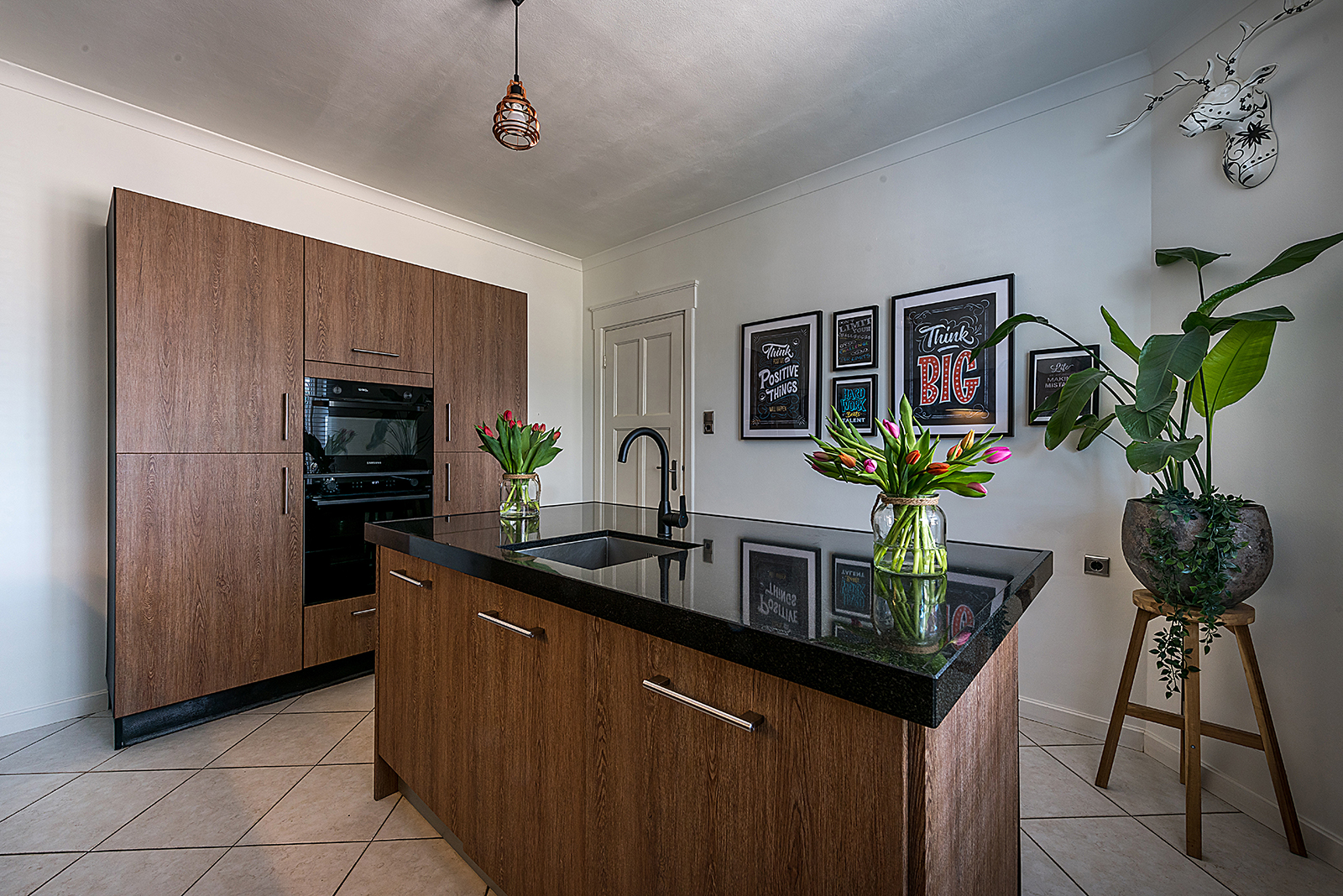 De dichte eetkeuken beschikt over een moderne aanbouwkeuken met hoogwaardige inbouwapparatuur, waaronder een inductiekookplaat, afzuigkap, oven, magnetron, koelkast, diepvries en vaatwasser. Het geheel wordt stijlvol gecompleteerd door een fraai granieten werkblad.