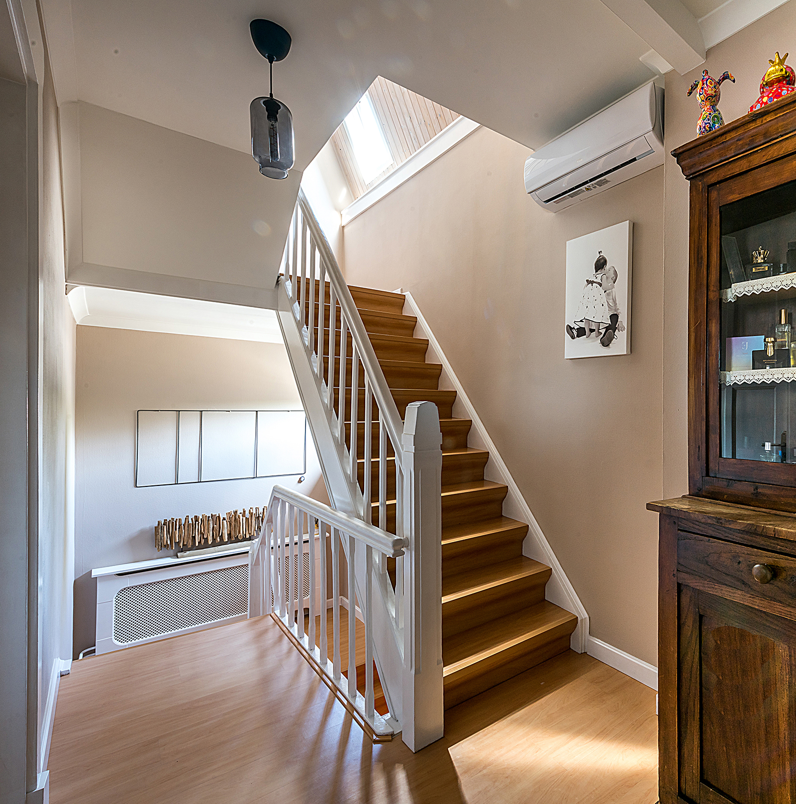 Via een authentieke bordestrap bereikt u de overloop met airco en toegang tot twee riante slaapkamers, beide afgewerkt met een laminaatvloer. 1 slaapkamer beschikt over een inbouwkast.