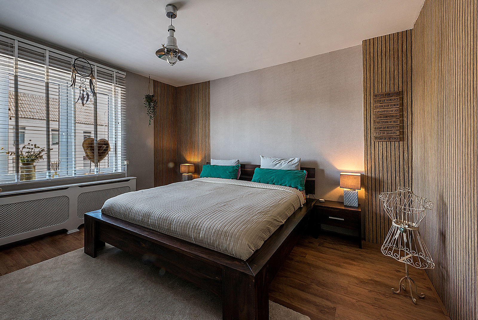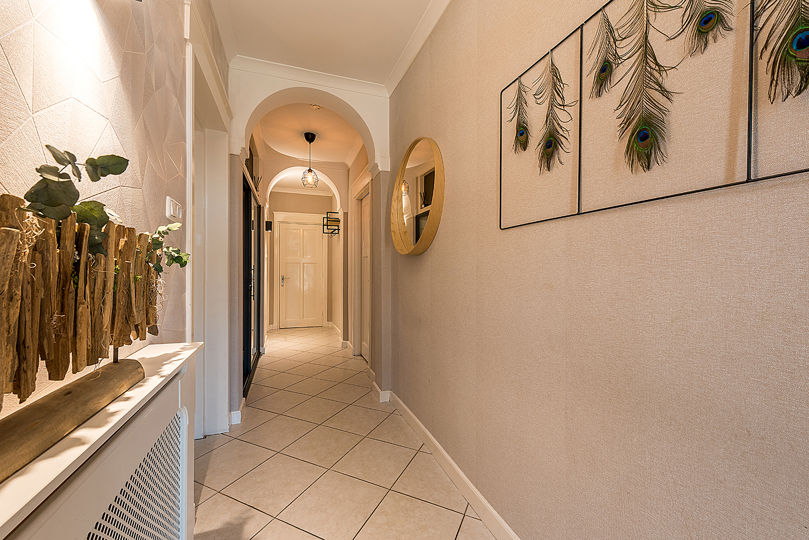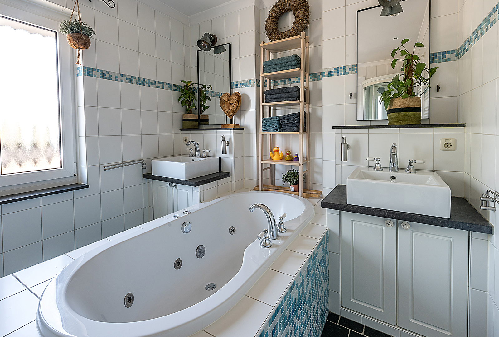 De moderne badkamer is compleet uitgevoerd en voorzien van een dubbele wastafel, een comfortabel ligbad met whirlpoolfunctie, een massage-douchecabine, een designradiator en een zwevend toilet.