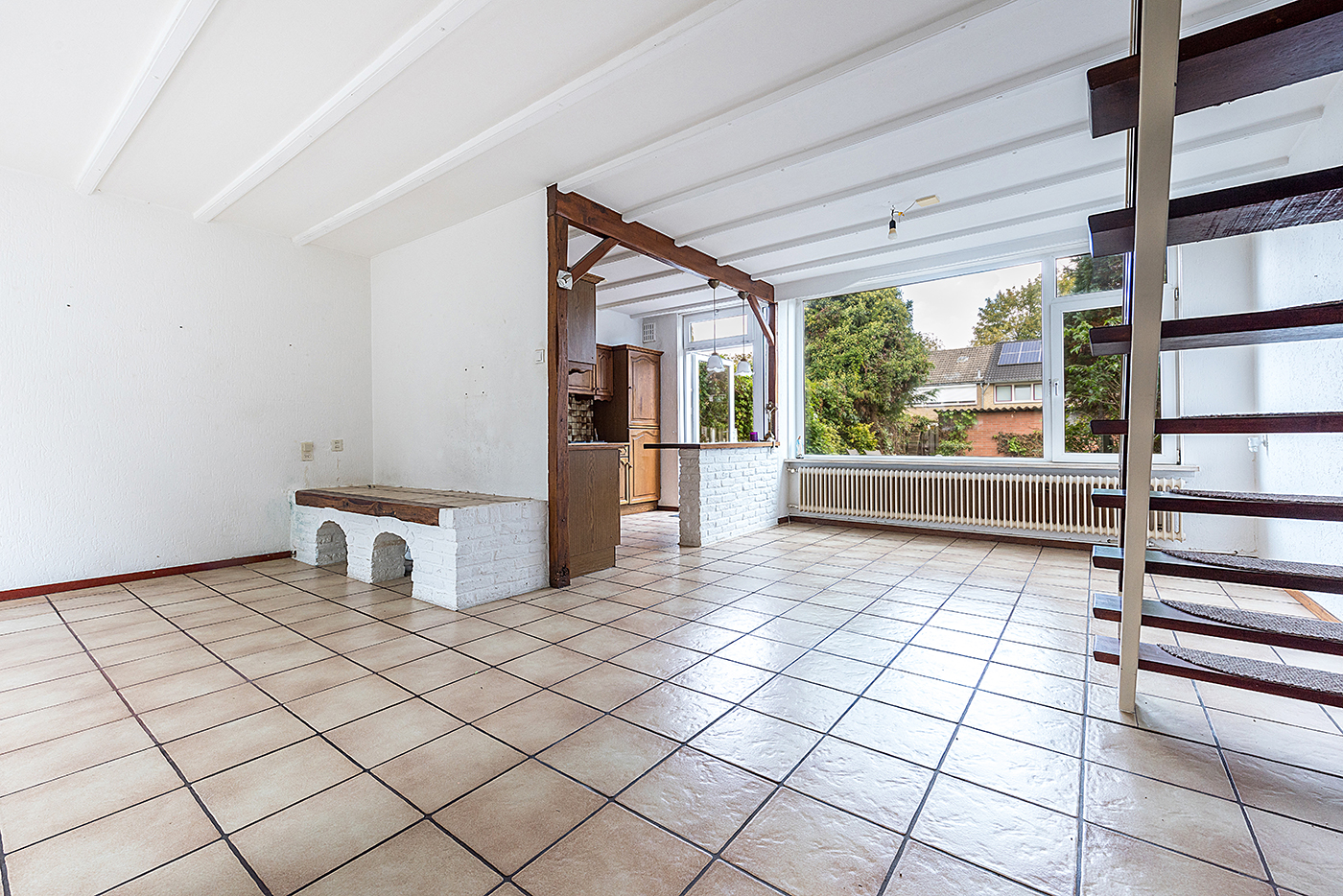Z-vormige living ca. 8.25 x 5.65/3.46/3.34 met tegelvloer en muurkast. Trap naar de verdieping.