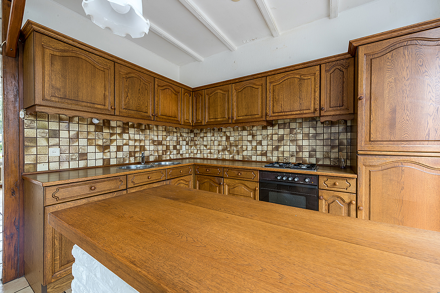 Open keuken ca. 3.25 x 2.21 met eiken aanbouwkeuken in hoekopstelling v.v. diverse apparatuur en eetbar.