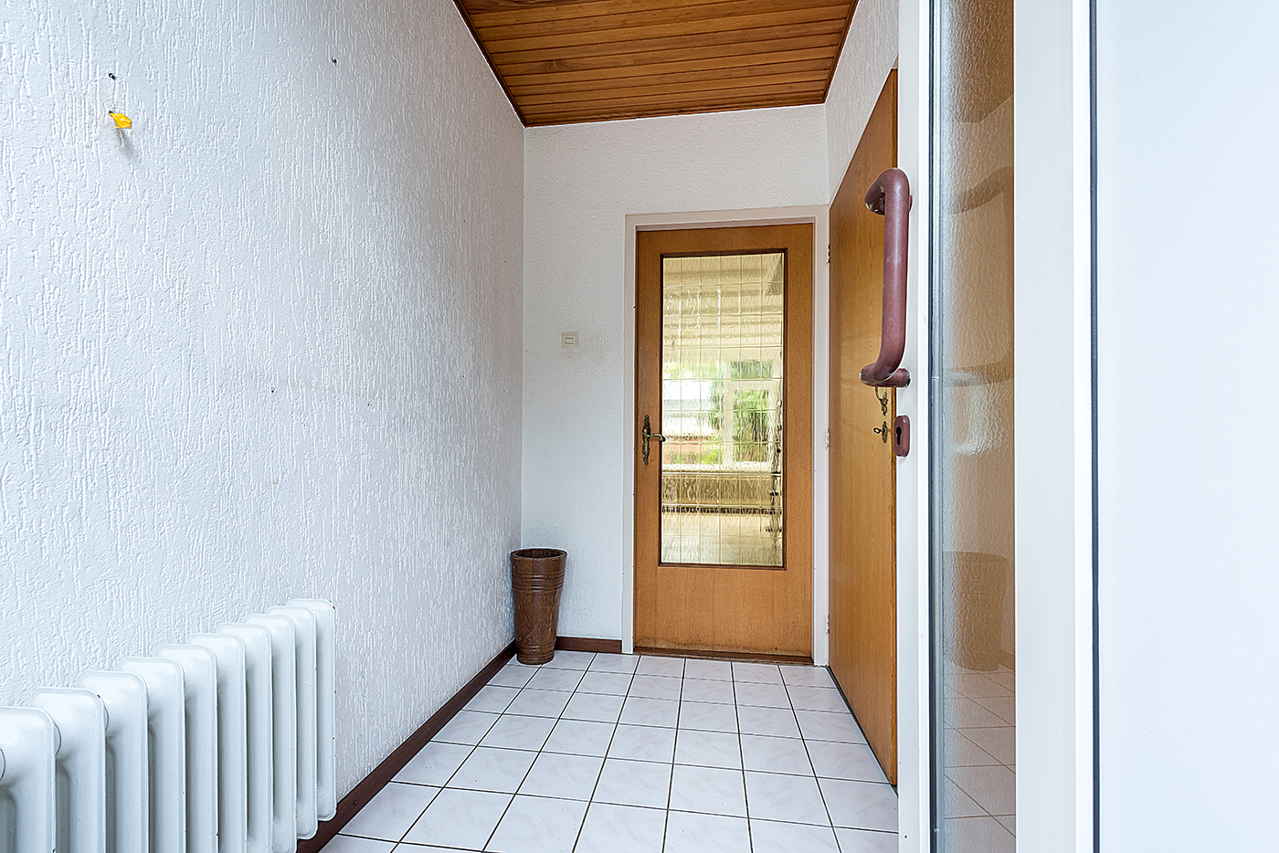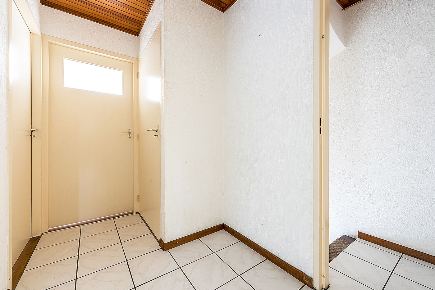 Entree/hal met tegelvloer, vernieuwde meterkast en gastentoilet met fonteintje.