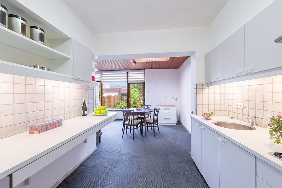 Keuken ca. 3.20×2.70 met aanbouwkeuken v.v. gascomfort, oven, magnetron, afzuigkap en koelkast.