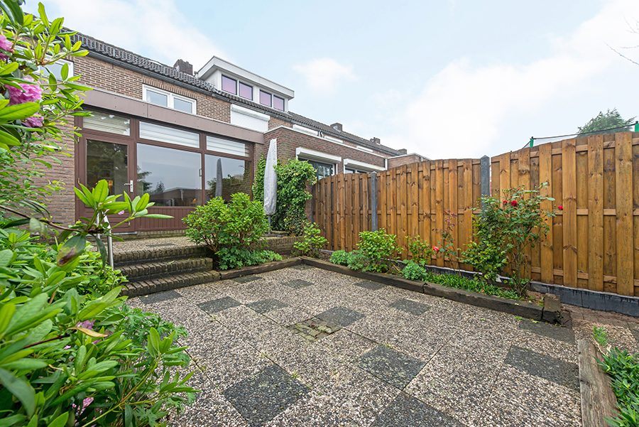 Vanuit de aanbouw toegang tot het terras met omsloten siertuin. Via poort toegang tot de garage ca. 7.00×3.50 en naastgelegen tweede tuin met mogelijkheid voor een 2e garage.