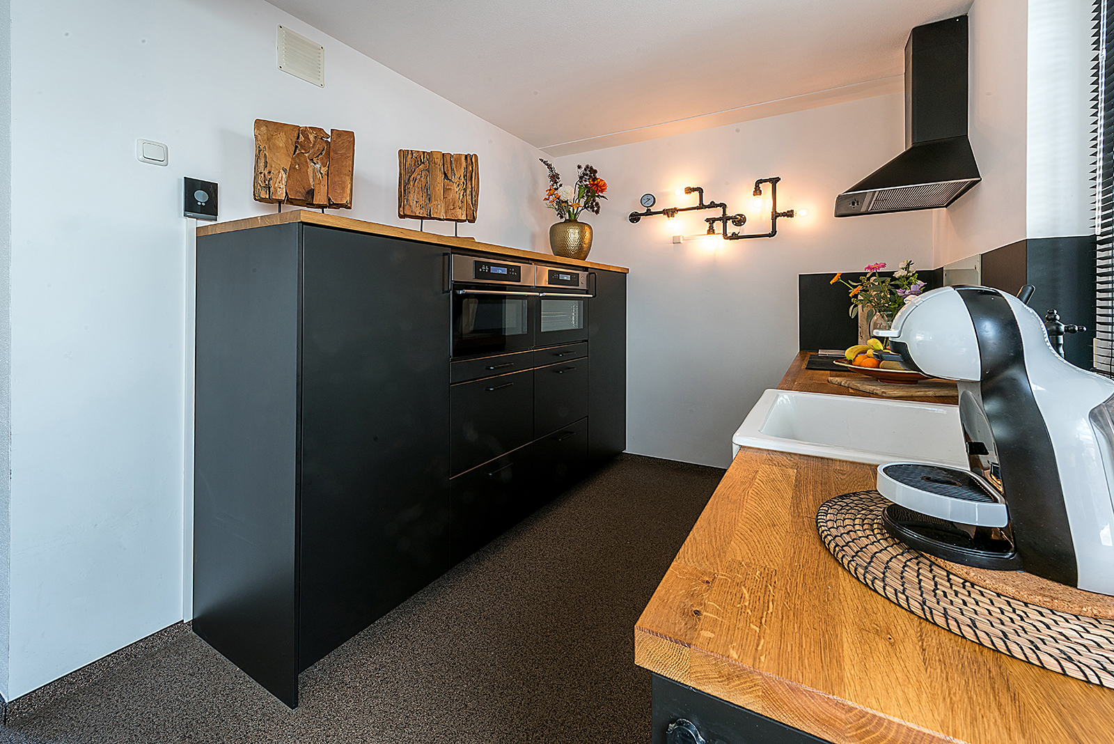 Open keuken ca. 2.20 x 2.00 met moderne mat zwarte aanbouwkeuken 2018 v.v. inductie kookplaat, afzuigkap, combi-oven, stoomoven, koelkast en vaatwasser.