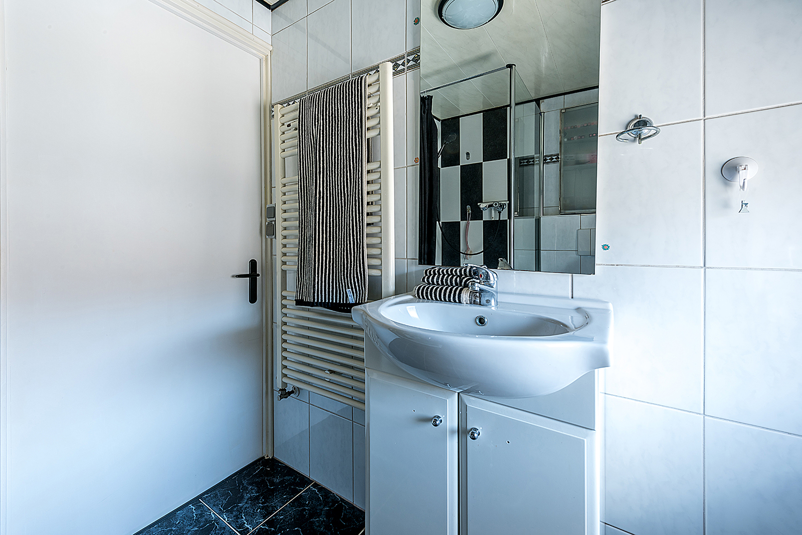 Badkamer met douche vaste wastafel en toilet.