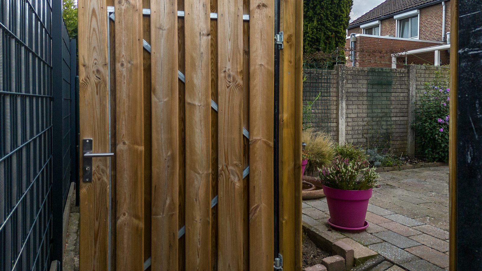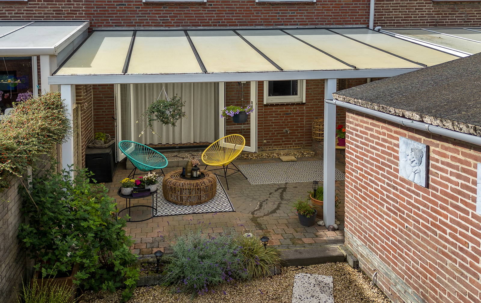 Omsloten siertuin met overdek zonneterras en buitenberging. De tuin is middels gezamenlijk pad aan de achterzijde bereikbaar.