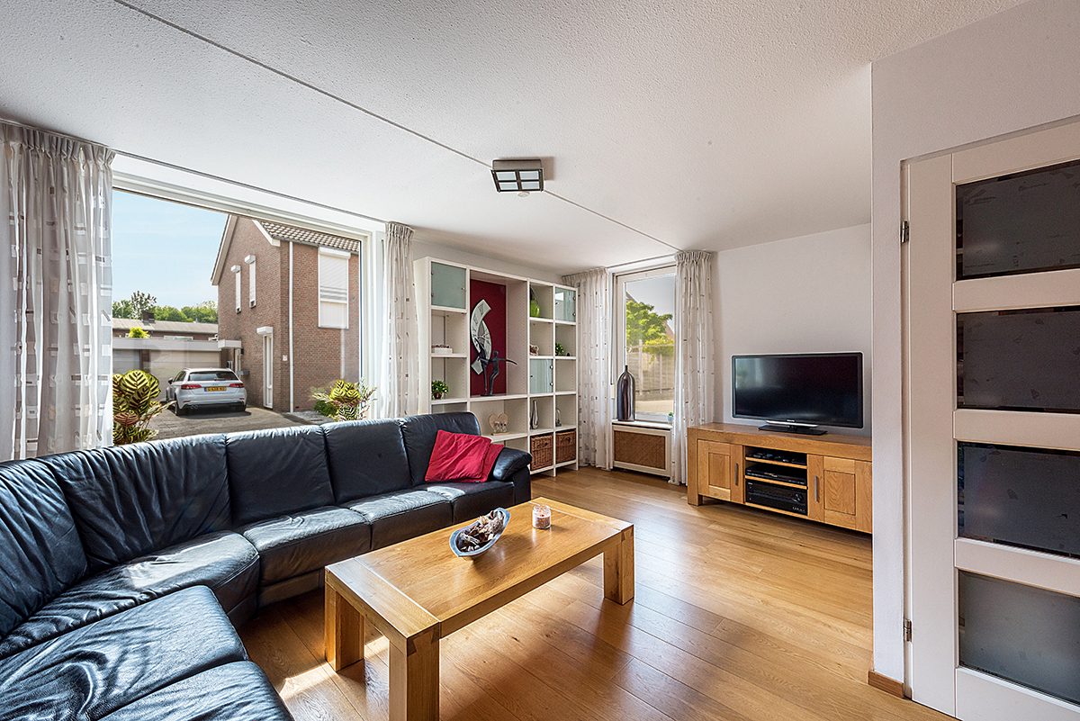 L-woonkamer ca. 8.80 x 5.17/2.81 met parketvloer en bergkast onder de trap.