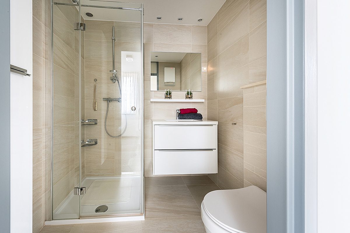 Moderne badkamer met inloopdouche wastafel en toilet.