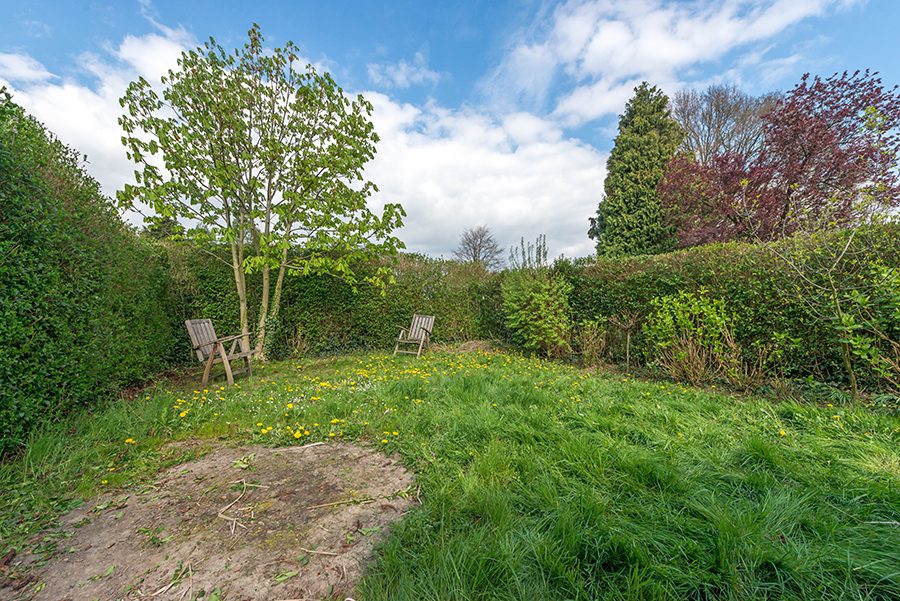 Omsloten tuin met buitenberging, zij-uitgang naar inrit.