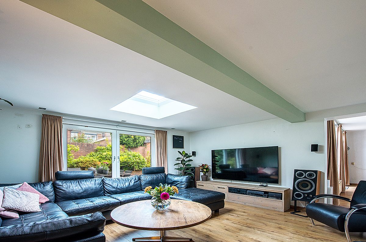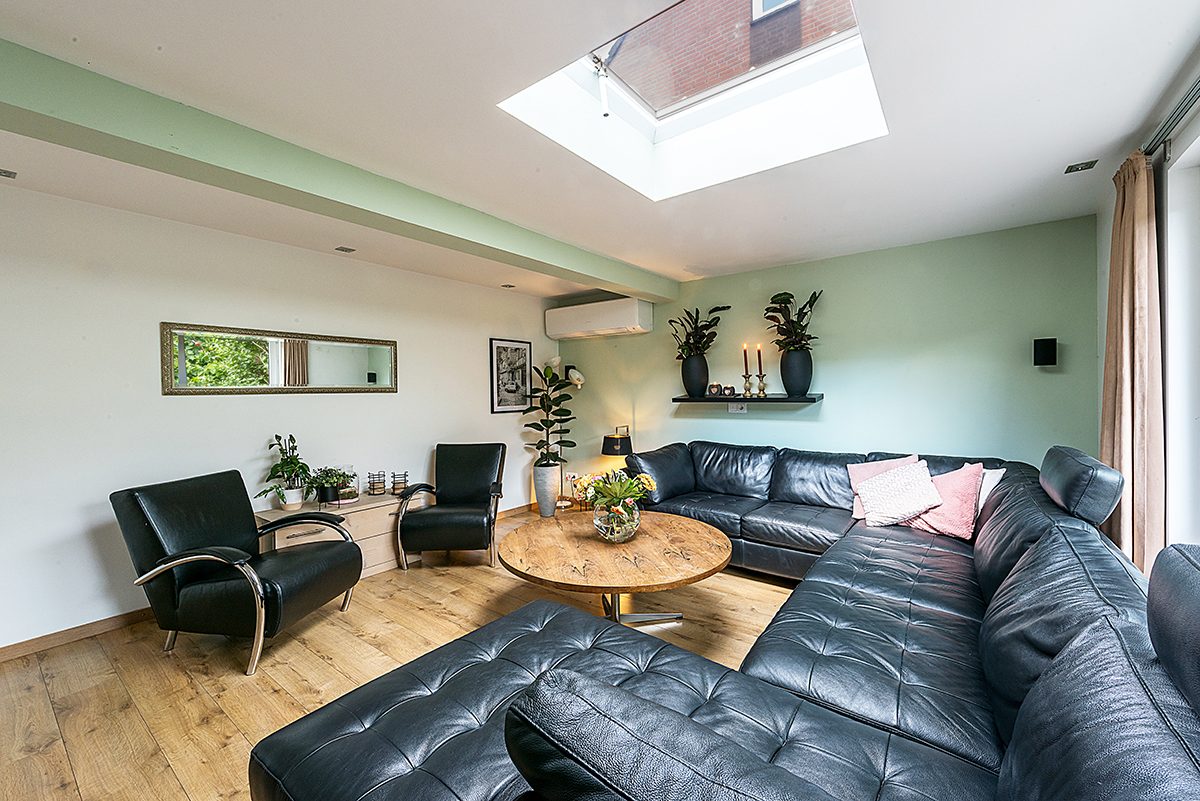 Gezellige aanbouw met zitkamer ca. 4.70 x 4.30 met airco, lichtkoepel en uitzicht op de tuin.