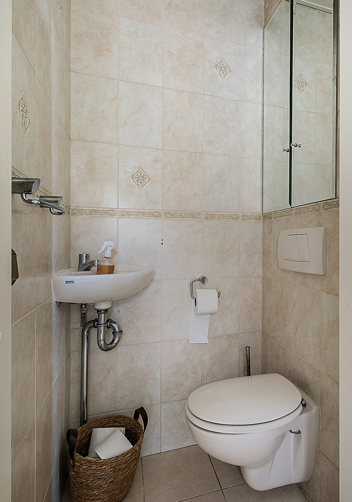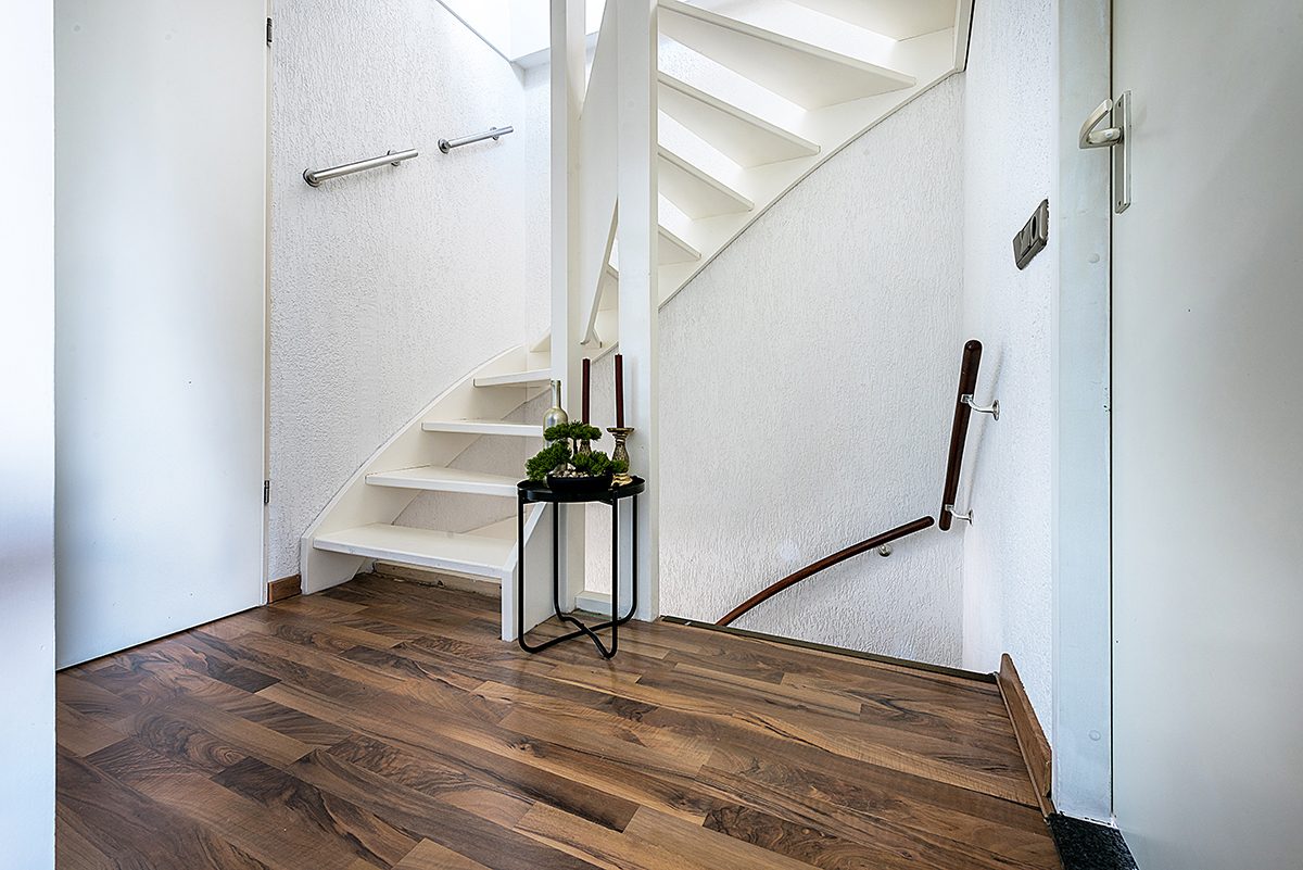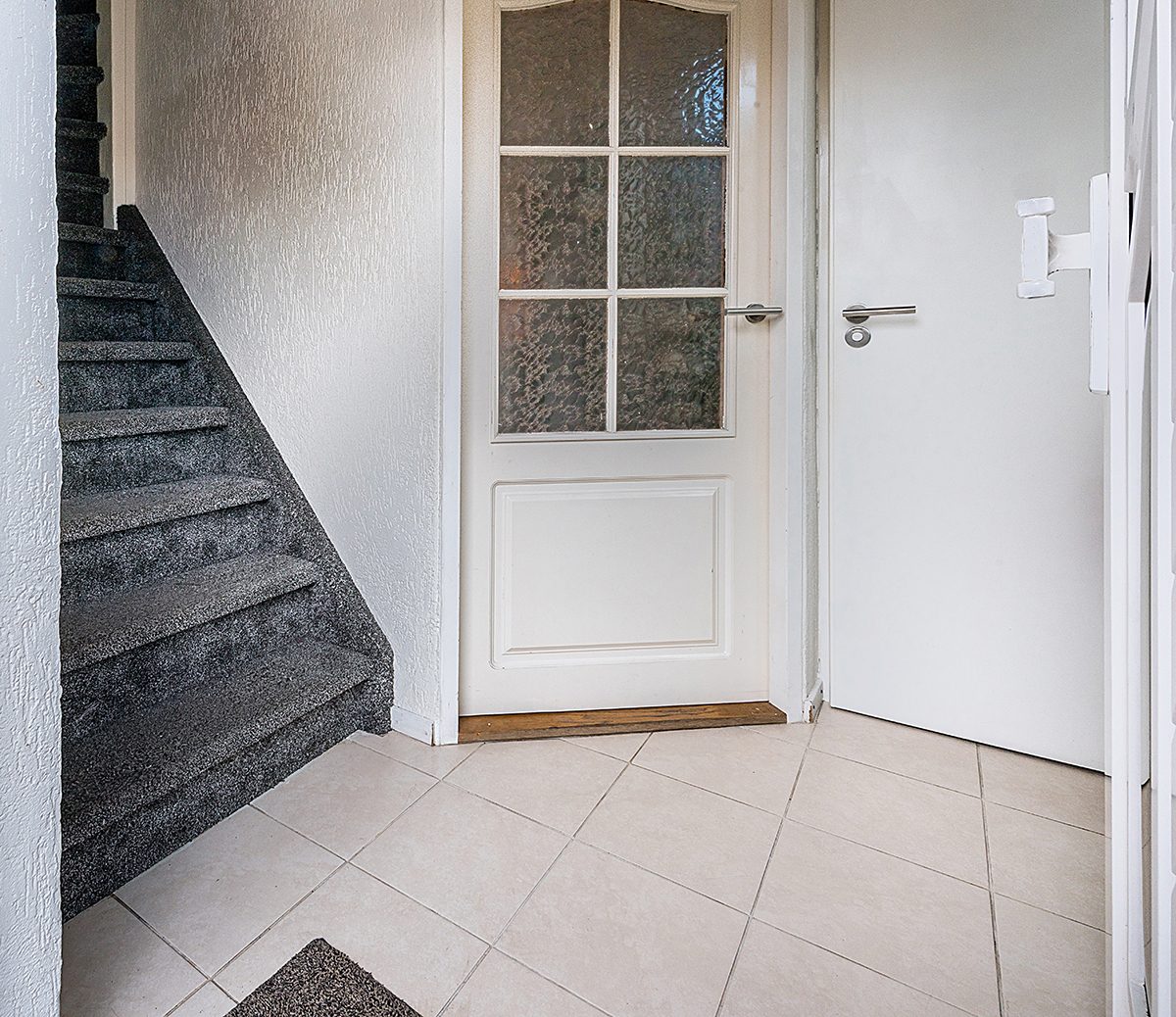 Entree/hal met tegelvloer, toilet met fonteintje en trap naar de verdieping.