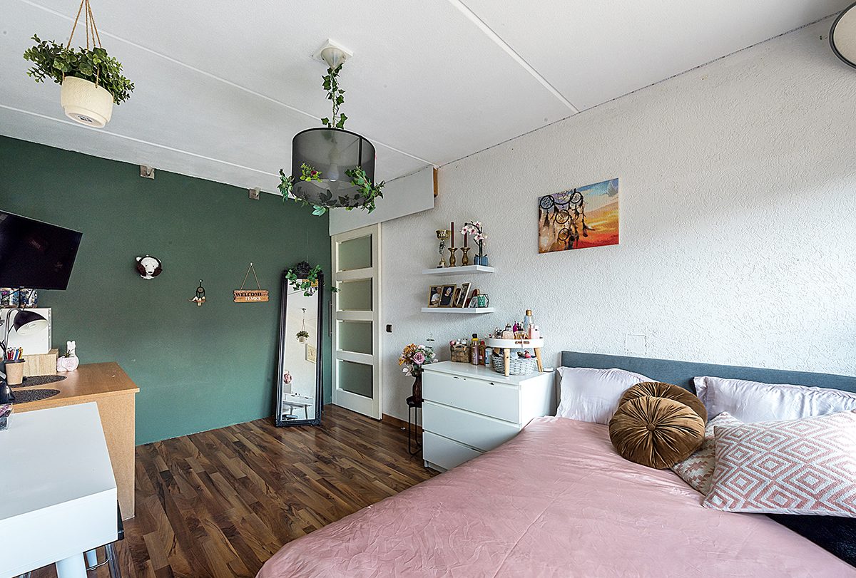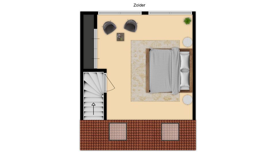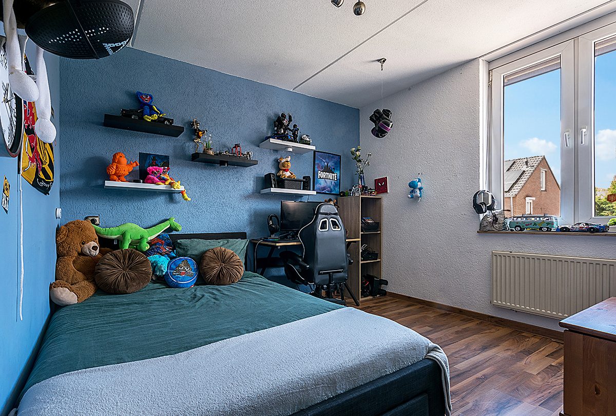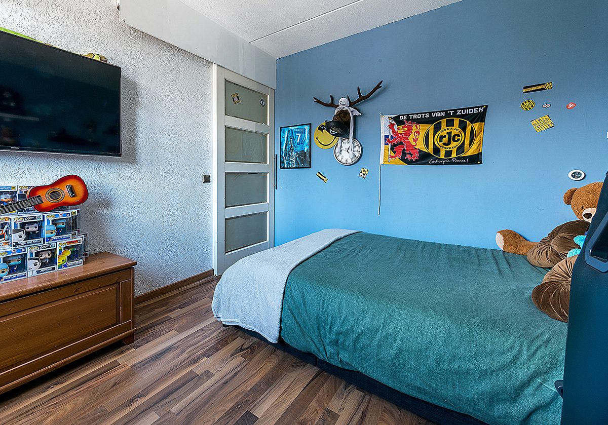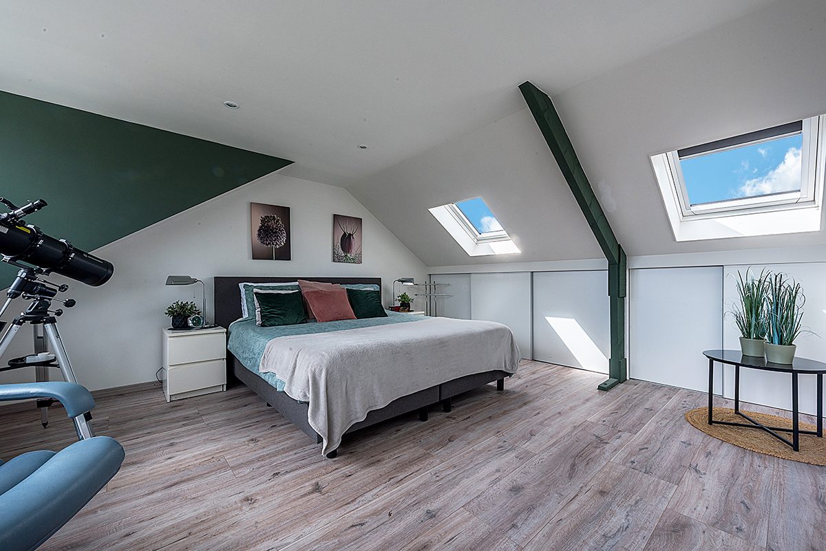 Vaste trap naar een vierde slaapkamer ca. 4.00 x 3.00 met 2 dakramen en dubbele dakkapel, kastenwand en airco.