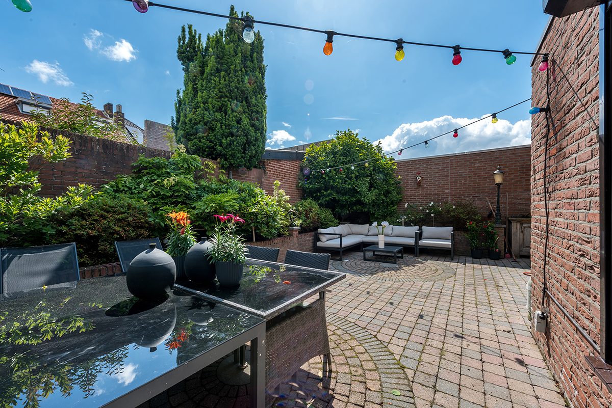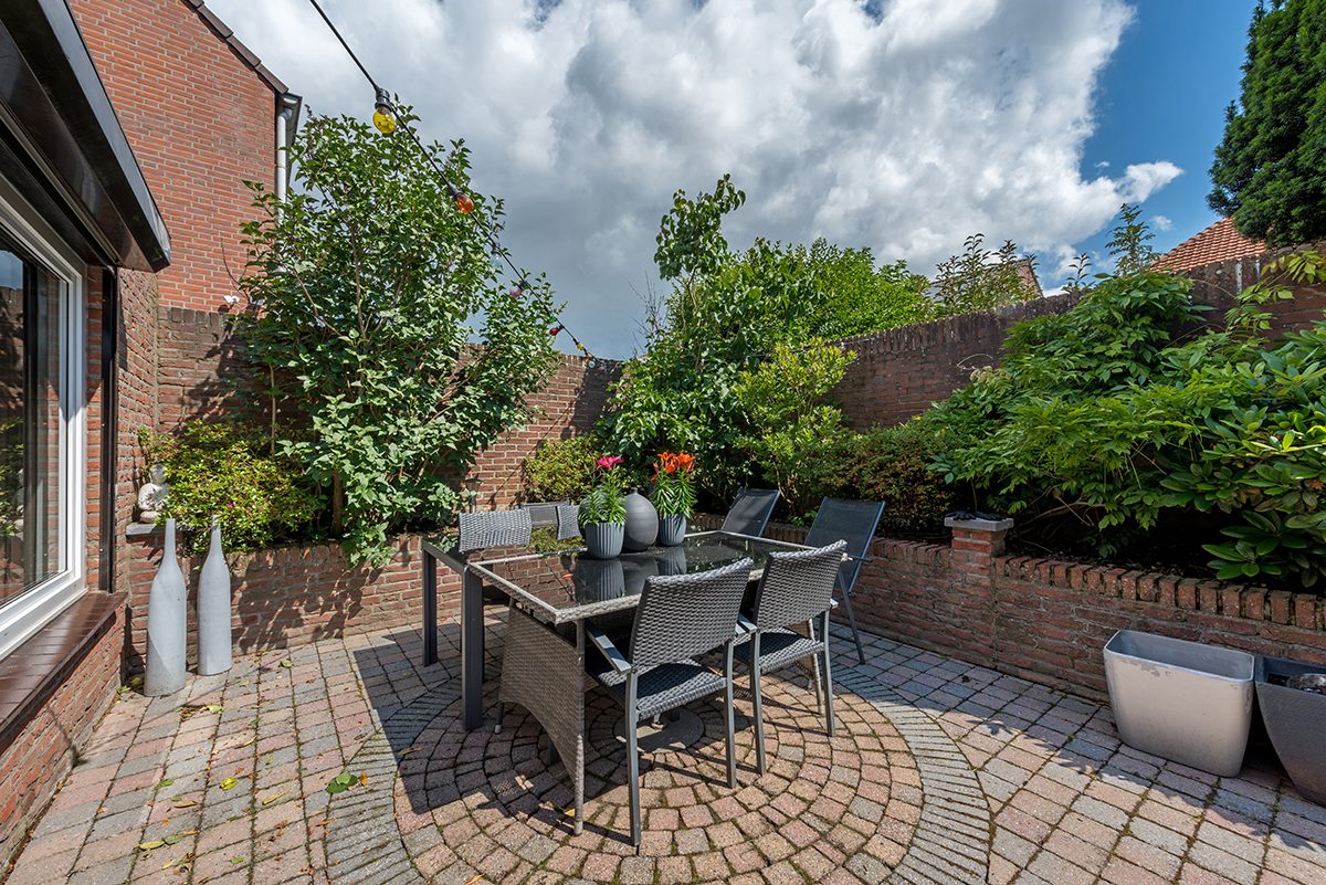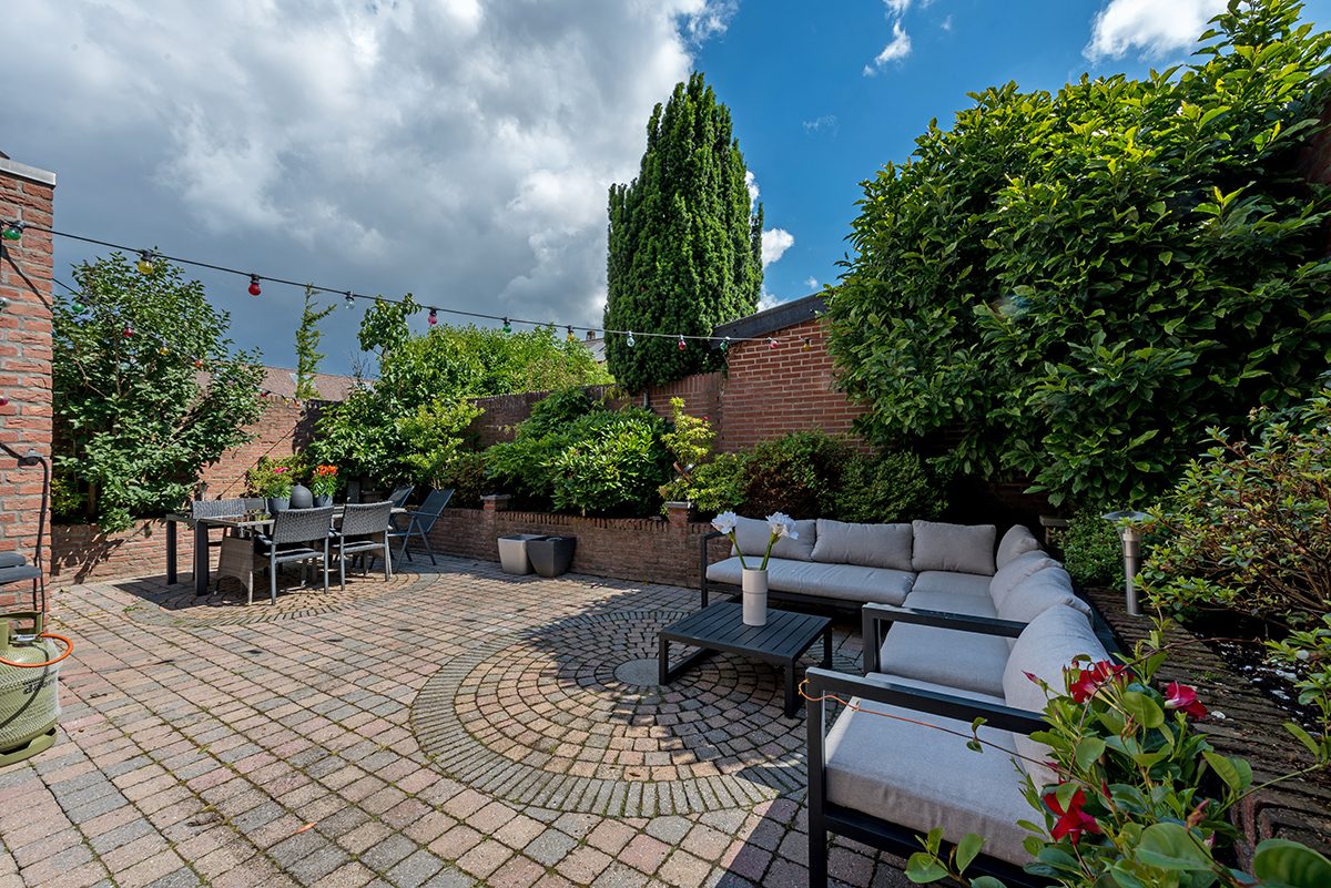 Omsloten en onderhoudsvrije siertuin met veel privacy en zonwering.