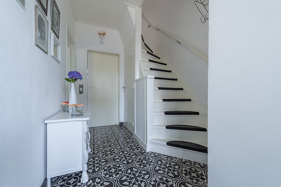 Entrée/hal met tegelvloer, gastentoilet met fonteintje, meterkast en trap naar de verdieping.